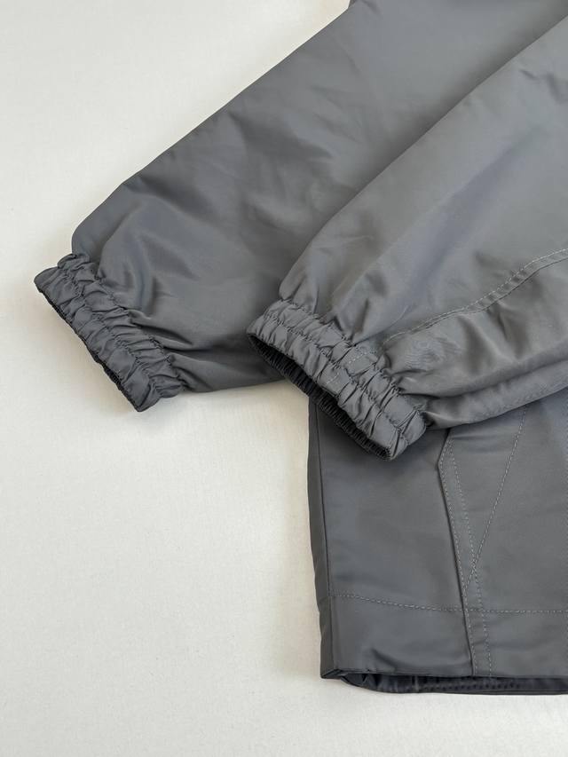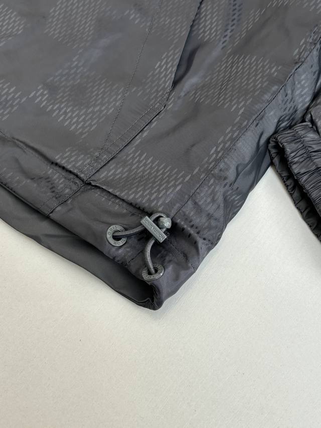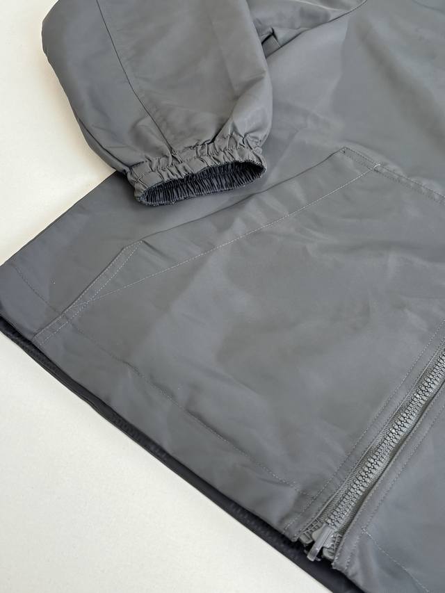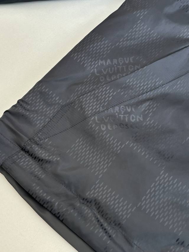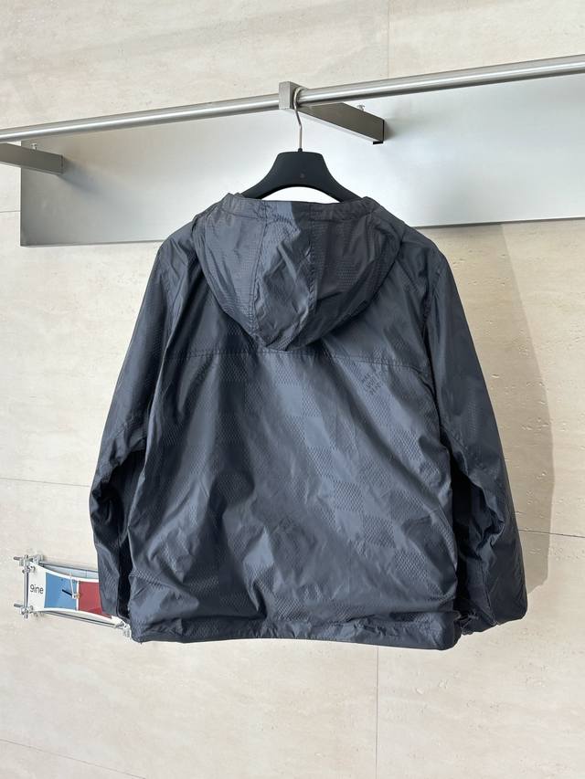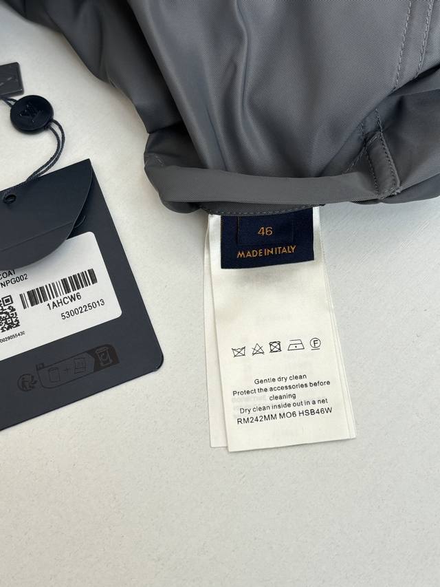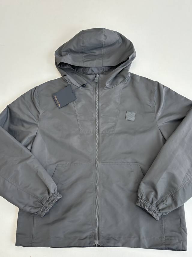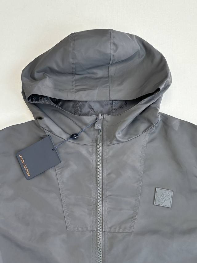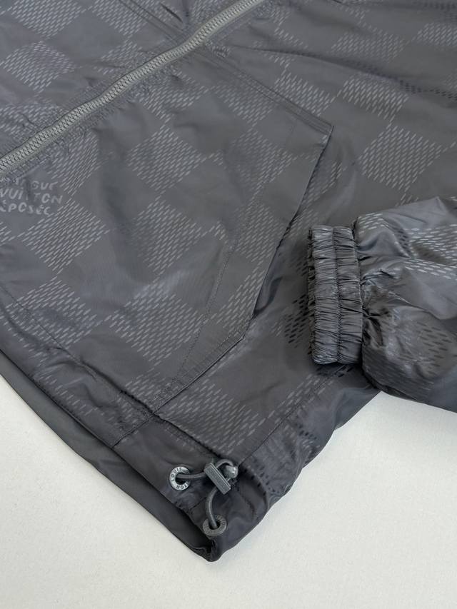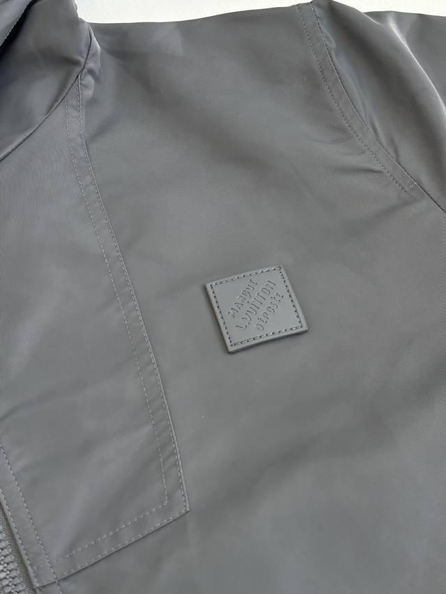 In Stock Ddd 1V Louis Cement Grey Double-Sided Windproof Leather Label Checkerboard Jacquard Zipper Jacket DDD The solid color fabric is made of dense matte nylon twill, while the other side is made of 50D nylon yarn-dyed jacquard fabric. The solid color front panel features laser-engraved positioning patterns, hand-stitched white brass, and a triangular safety pin with a logo and glossy finish. The front pockets have metal keychains for hanging folding tags. The jacquard lettering on the front placket is a single-piece, purely handmade reproduction pattern cut, with all pieces numbered. The pockets are also reproduced pattern numbered. The fabric is relatively light and silky, requiring precise cutting, which is extremely time-consuming. It features a double-loop zipper with #5 track teeth in the center front, and the hem and hood have spiral elastic cords with round anti-slip buckles and square pig-nose buckles with the logo. All openings are made with metal and logo eyelets matching the fabric color DDD Size: 46 48 50 52 DDD