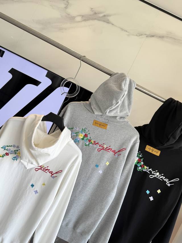 Louis Vuitton 2025 Autumn Floral Tajima Embroidery Original Single-Piece Boutique Couple Casual Hooded Sweatshirt (Ddd Top Version)! Customized 440g cow terry cloth fabric! American acid washed distressed original fabric, laser burnishing appliqu