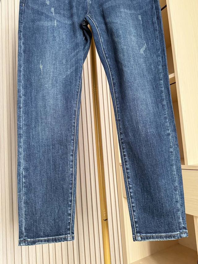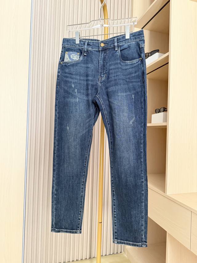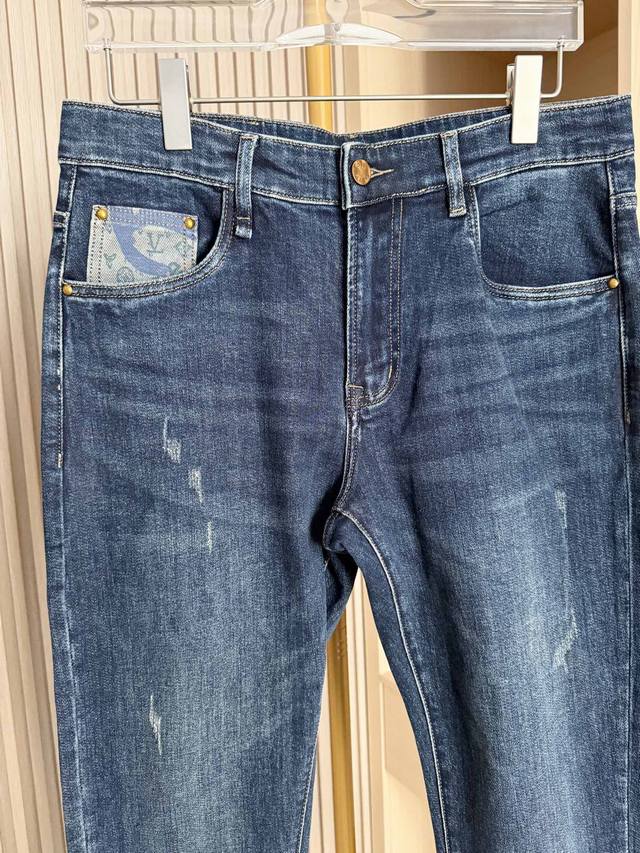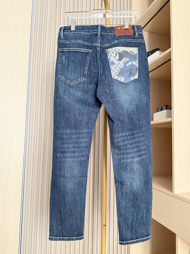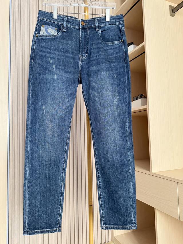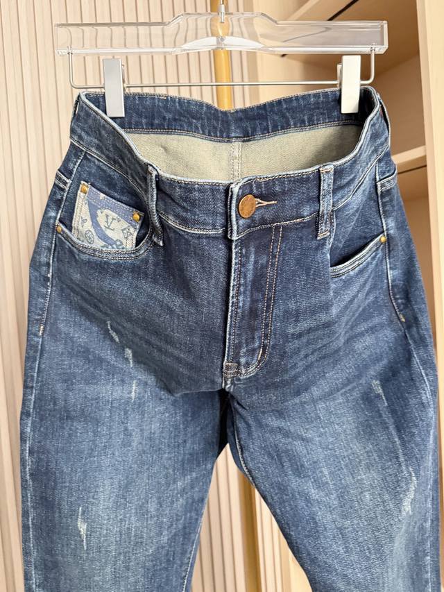 Louis Vuitton - 2025 New Arrival Jeans! Made from premium denim fabric, treated with a special process, these jeans combine a soft feel with a crisp silhouette. Durable, long-lasting, and breathable, they offer comfortable and unrestricted everyday wear. The classic denim blue wash and distressed finish exude a vintage charm. The back pockets feature the brand's signature printed patchwork design, adding a unique and eye-catching touch, showcasing distinctive taste and breaking away from the monotony of typical denim pieces. The slim fit flatters the legs, creating a streamlined silhouette and accommodating various body types for a casual yet stylish look. Sizes: 29-38. Comes with Lane Crawford Hong Kong gift box.
