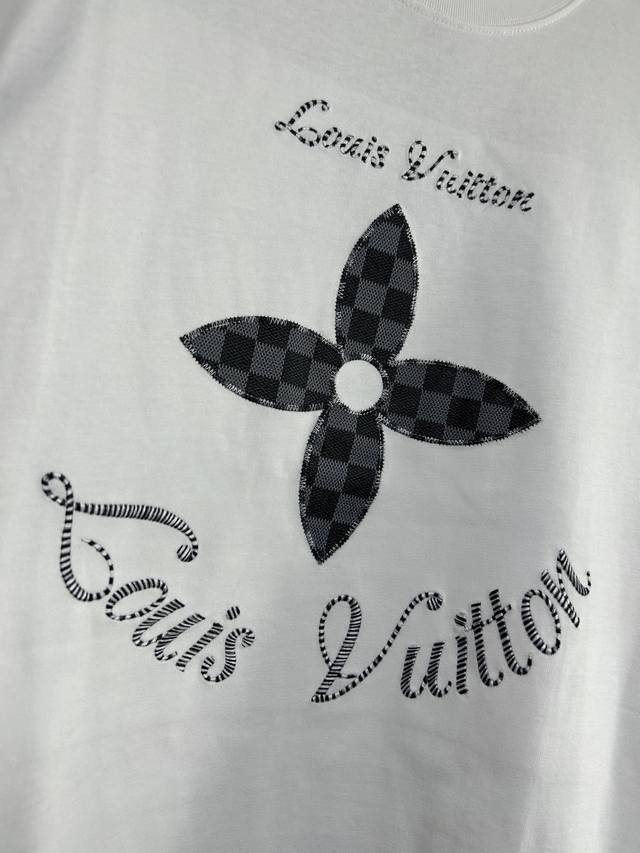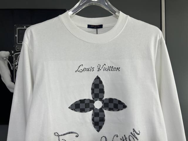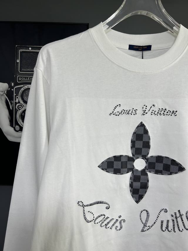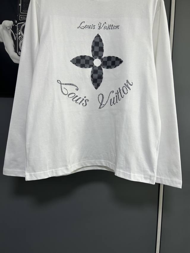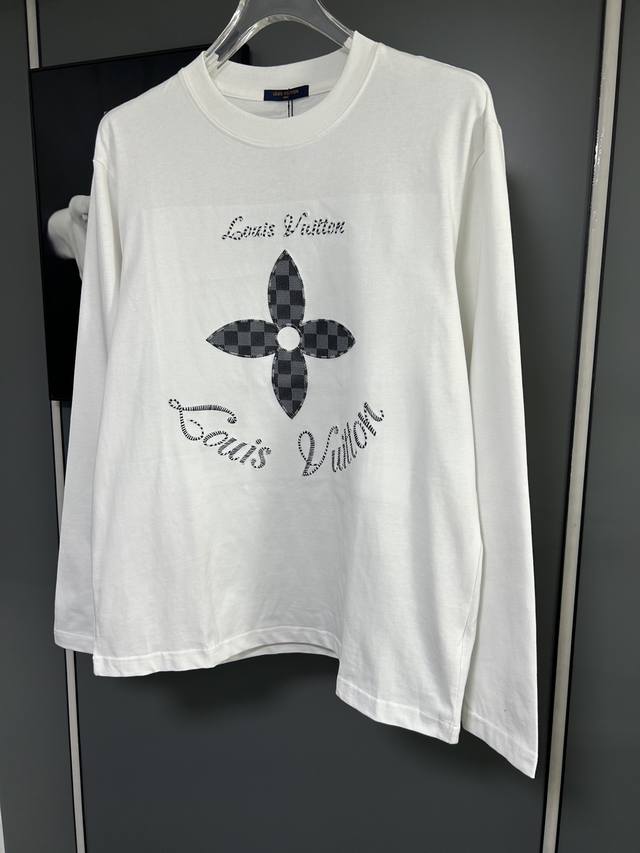 Louis Vuitton 2025 New Checkerboard Embroidered Four-Leaf Clover Letter Logo Custom Leather Patch Unisex Long-Sleeve T-Shirt Custom 280g Pure Cotton Fabric Custom Dyed 32-Count Double-Strand Ribbed Finish Complete with Neck Label, Hangtag, Main Label, and All Labels Complete Color: White Sizes: Xs, S, M, L
