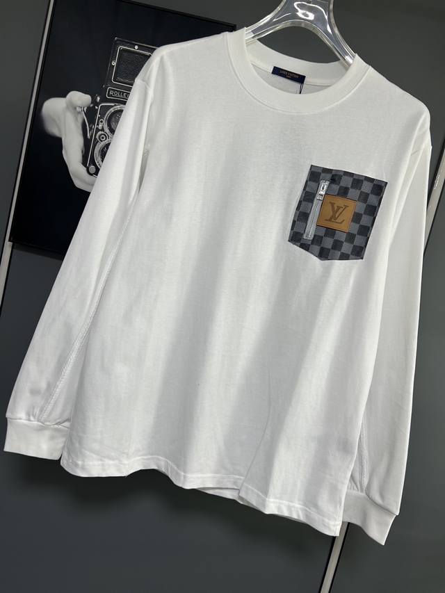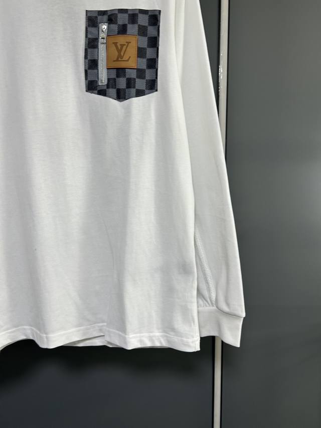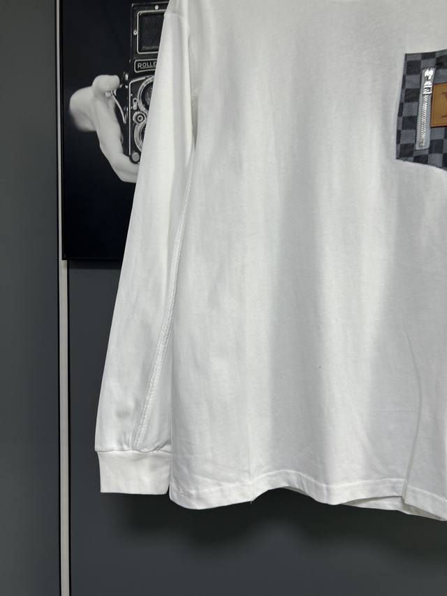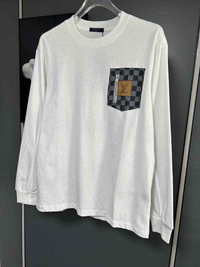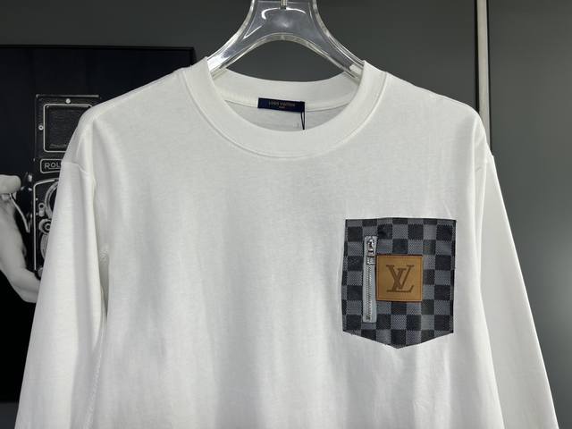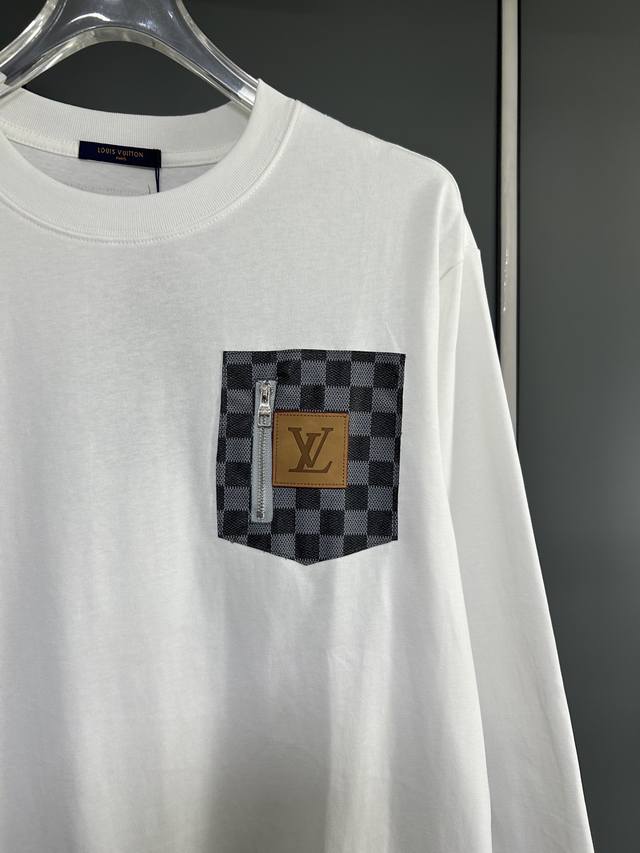 Louis Vuitton 2025 New Checkered Pocket Zipper Letter Logo Custom Leather Patch Unisex Long-Sleeve T-Shirt Custom 280g Pure Cotton Fabric Custom Dyed 32-Count Double-Strand Ribbed Finish Complete with Neck Label, Hangtag, Main Label, and All Labels Complete Color: Black Sizes: Xs, S, M, L