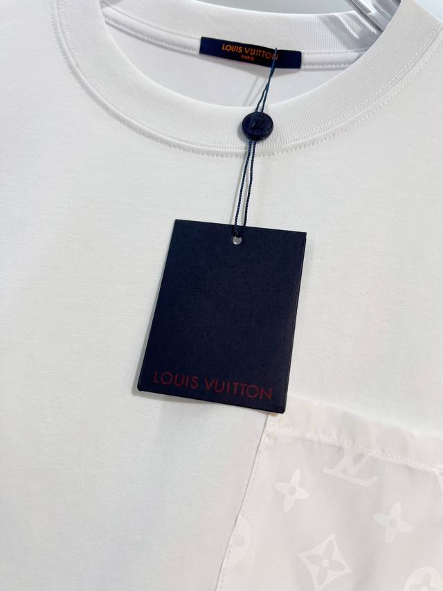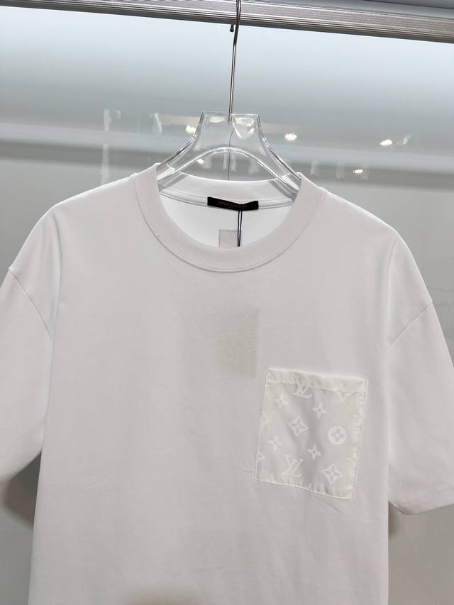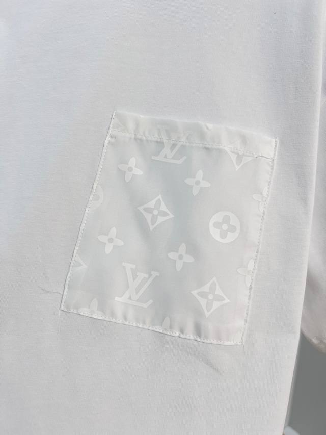 Louis Vuitton 2026 New Woven Monogram Pocket Back Custom Logo Patch Unisex Short-Sleeve T-Shirt. Custom 320g 100% Double Yarn Pure Cotton Fabric. Dyed 32-count Double-Strand Ribbed Fabric. Complete with Neck Label, Hang Tag, and Main Label. Color: White. Sizes: S, M, L, XL.