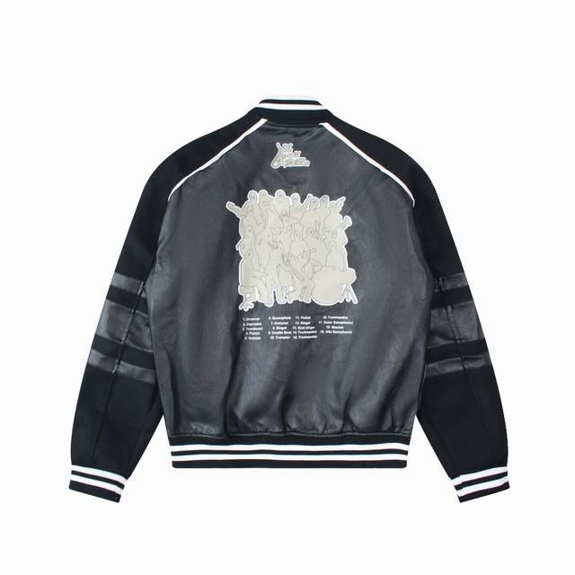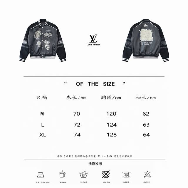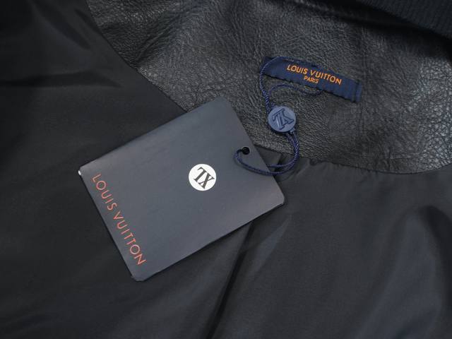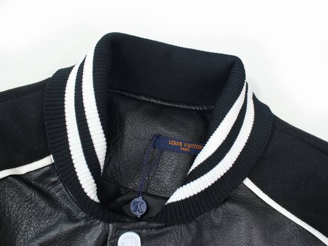 Louis Vuitton 23Ss latest celebrity-style baseball jacket, worn by JJ Lin and Neymar. A super popular 23Ss style jacket. Features a wool and leather patchwork design, high-end and trendy cut, L-neck, hem, and cuffs with a two-tone, double-grit knit ribbed texture. Color: Black. Size: M-XL. See picture nine for details.