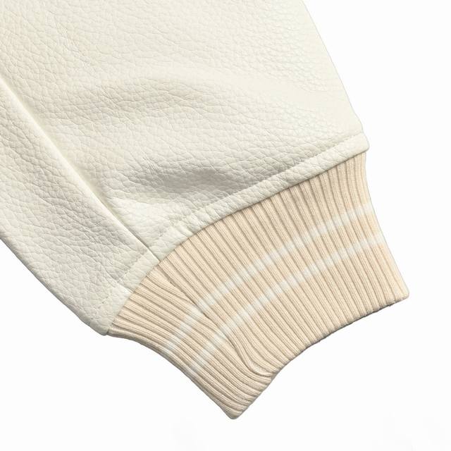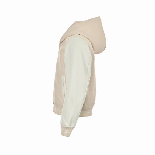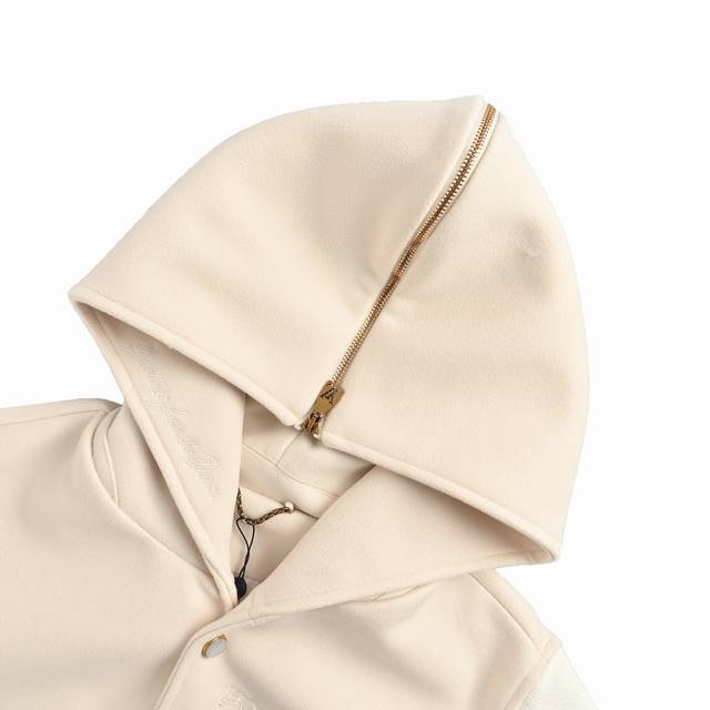 ). This baseball jacket combines a lightweight sheepskin body with cowhide leather sleeves. Its nautical-style collar can be zipped into a hood. The body features exquisite beaded logos and LV Seashells embroidery, the hood is adorned with an embroidered slogan, and pearlescent snap buttons add a touch of sophistication. (