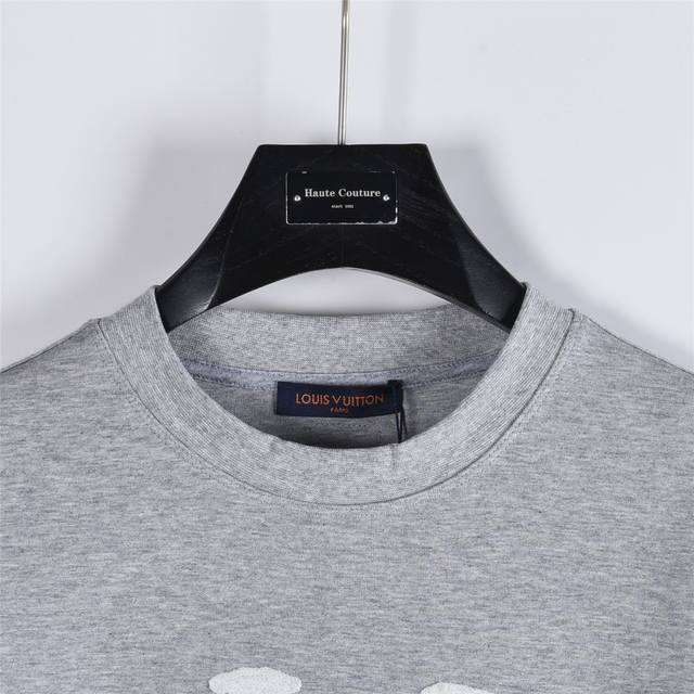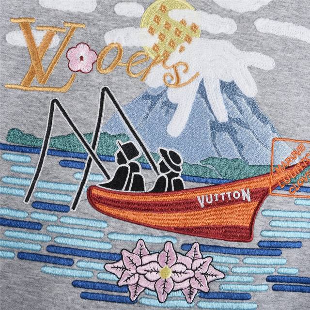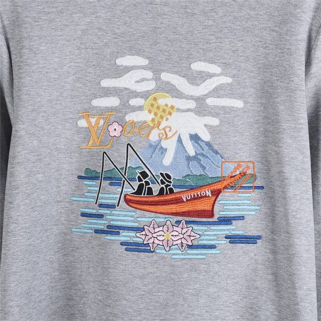 Louis Vuitton 25Fw Angler Landscape Embroidery Long-Sleeve T-Shirt. Custom-woven, dyed, washed, smooth long-staple cotton, 310g/m?, latest boutique style. Long-sleeved base layer. Wide ribbed trim on the neckline and cuffs echoes the hem. Original design disassembled and customized; all fabrics and accessories are top-quality. Features a Braunta embroidery on the chest with gold LV lettering and pink cherry blossom accents, lifelike elements such as sailboats, waves, and flowers. Exquisite workmanship, imported overlock technology on the cuffs, perfectly replicating the boutique details. Colors: Gray, White. Size: M-XXL.