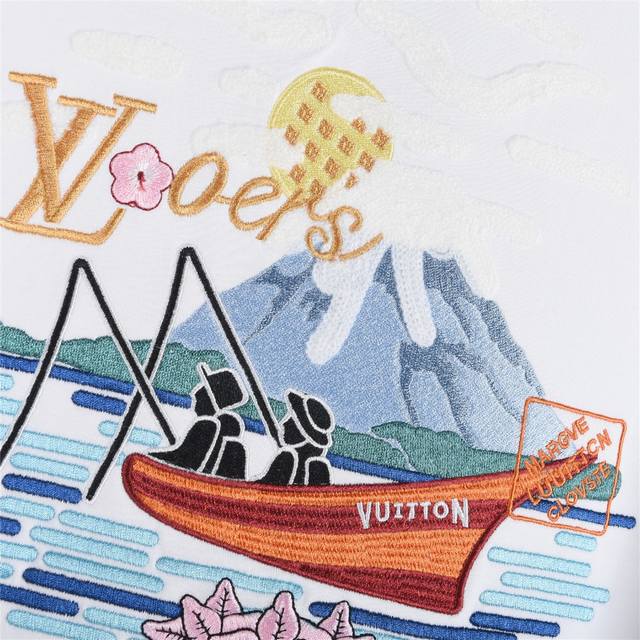 Louis Vuitton 25Fw Angler Landscape Embroidery Long-Sleeve T-Shirt. Custom-woven, dyed, washed, smooth long-staple cotton, 310g/m?, latest boutique style. Long-sleeved base layer. Wide ribbed trim on the neckline and cuffs echoes the hem. Original design disassembled and customized; all fabrics and accessories are top-quality. Features a Braunta embroidery on the chest with gold LV lettering and pink cherry blossom accents, lifelike elements such as sailboats, waves, and flowers. Exquisite workmanship, imported overlock technology on the cuffs, perfectly replicating boutique details. Colors: Gray, White. Size: M-XXL.