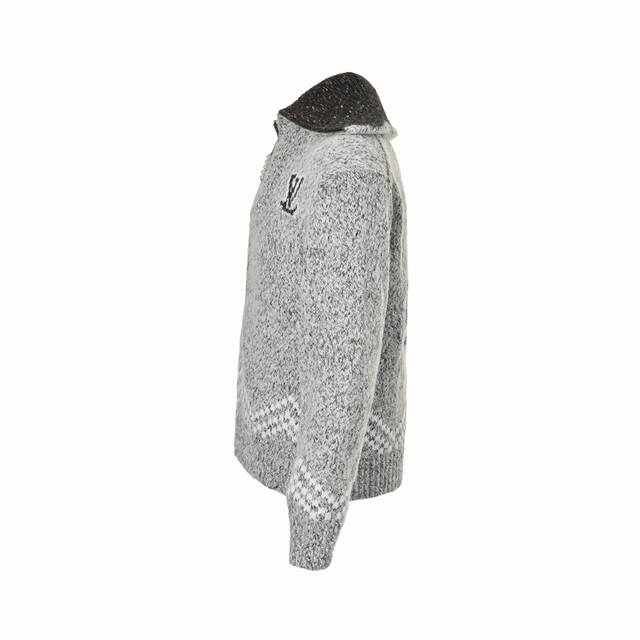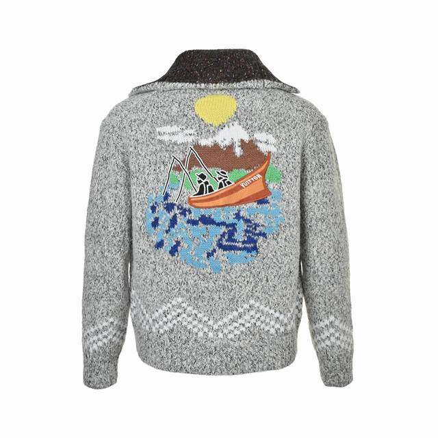 Louis Vuitton 25Fw Angler's Countryside Jacquard Zip-Up Sweater Cardigan DDD This shawl-style zip-up jacquard sweater cardigan draws inspiration from the Fall/Winter 2025 runway show, DDD featuring bright embroidery depicting pharrell Williams and Nigo leisurely fishing in a pastoral setting, DDD witnessing the designers' harmonious collaboration and deep friendship. DDD The Marque L.Vuitton D