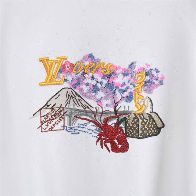 Louis Vuitton 25Fw Cultural Landscape Embroidery Long-Sleeve T-Shirt. Custom-woven, dyed, washed, smooth long-staple cotton, 310g, latest boutique style. This cotton long-sleeve shirt features a pattern created by Pharrell Williams and Nigo for their 2025 Fall/Winter collection. Various embroidery techniques depict vibrant scenery, showcasing a delightful fusion of traditional Japanese culture and brand elements. The subtle Monogram embroidery below the pattern adds a delicate texture. Features include: embroidered logo on the front, ribbed collar, and a back label. Colors: Black, White. Sizes: M-XXL.