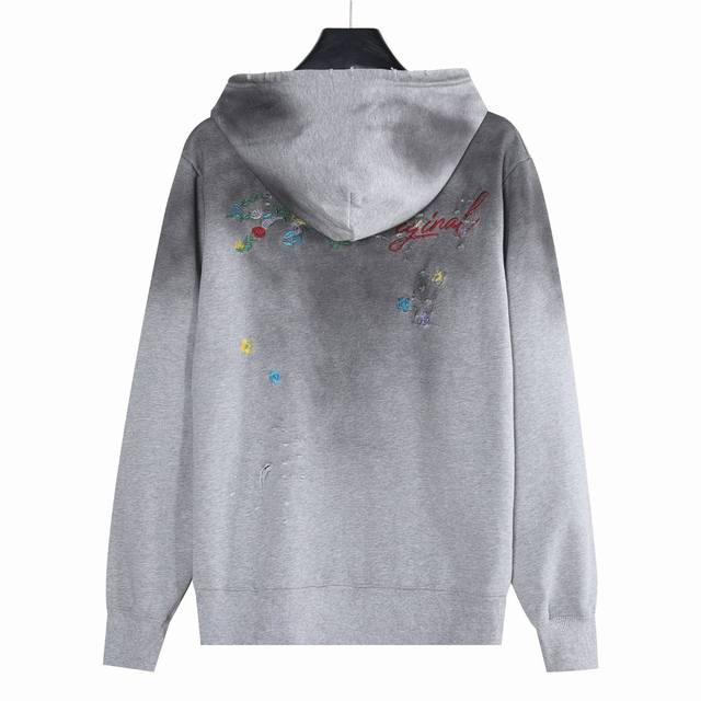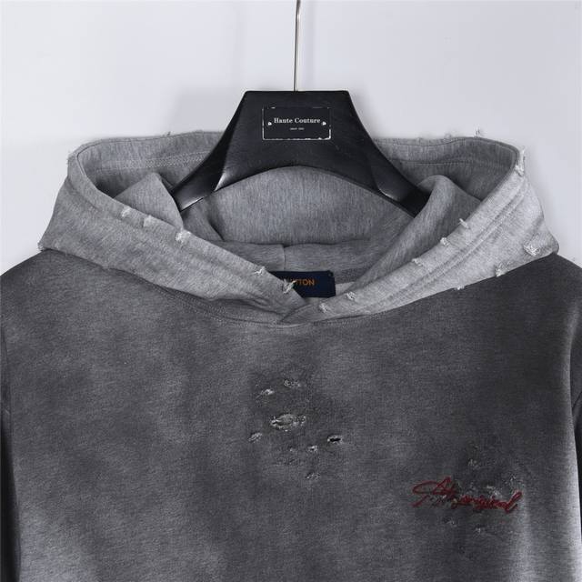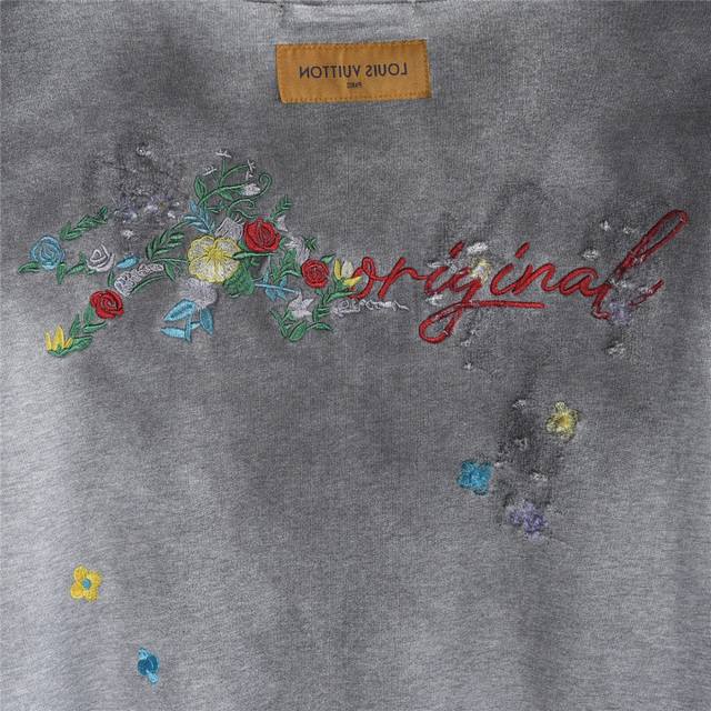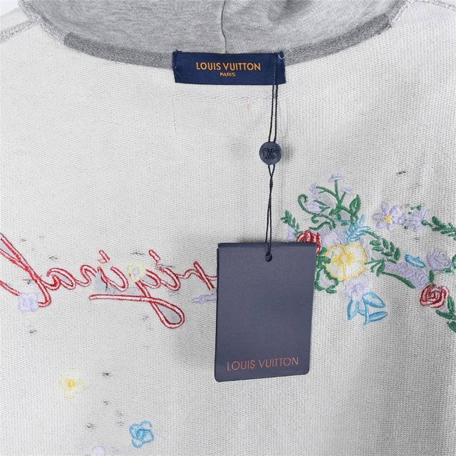 Louis Vuitton 25Fw Floral Letter Embroidery Back Washed Distressed Hooded Sweatshirt. Made with double-ply, double-yarn pure cotton sweatshirt fabric. The fabric uses a double-ply twisted weave, increasing strength by 40% compared to single-ply yarn, creating a textured surface similar to cow's stomach. It maintains the moisture-wicking and breathable properties of pure cotton while achieving softness without sagging due to the double-ply thickness. The logo embroidery uses Tajima embroidery techniques. The washed and distressed finish gives the garment a relaxed, effortless style. Whether for everyday wear or workouts, it showcases your trendy attitude and makes you the center of attention. All three logos are included. Colors: Washed Black, Washed White, Washed Gray. Size: SX1