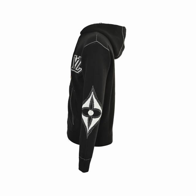 This zip-up cotton hoodie features a lightweight silhouette intricately intarsia weave. Oversized Monogram flowers are featured on the front and elbows, while dotted lines create the illusion of visible stitching and embroidery.