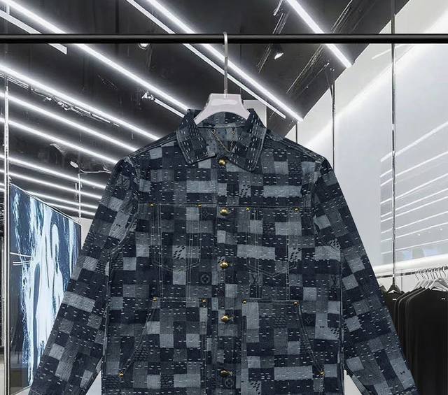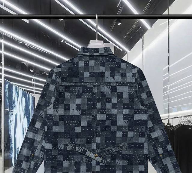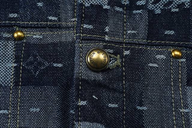 Louis Vuitton 25Fw Luxury Checkered Monogram Jacquard Jacket Set, Custom-made Glossy Dome Metal Buttons, Unisex Everyday Commute Essential Jacquard Denim Jacket Set. Custom-woven Monogram jacquard fabric. Garment washed grey with a yeast-drying process. Custom-made white pearl engraved buttons. Newly designed accessories, leather patch, full-wheat jacket with custom stitching. Original label, washed tag, and packaging. Sizes: S, M, L, XL.