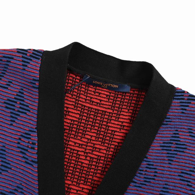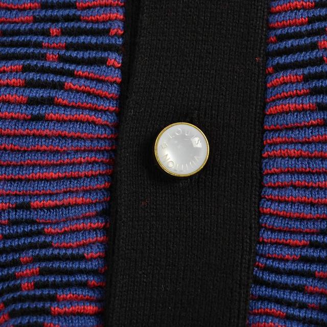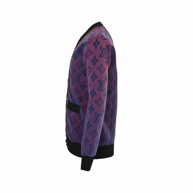 Louis Vuitton 25Fw Monogram Jacquard Striped Cardigan. Made with 50% wool yarn (16 count), 35% cashmere, and 15% synthetic fibers. Features a complex jacquard weave technique, incorporating Louis Vuitton's classic Monogram pattern or iconic new collection motifs such as checkerboard and rainbow gradient. Includes black pockets, custom original pearlescent buttons, ribbed cuffs and hem, original label, wash tag, and brand moisture-proof paper packaging. Color: Violet. Size: S-XL.