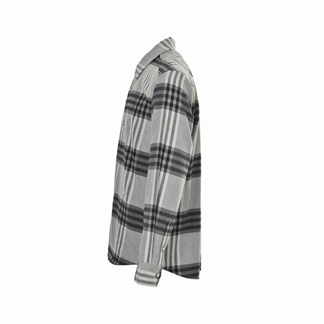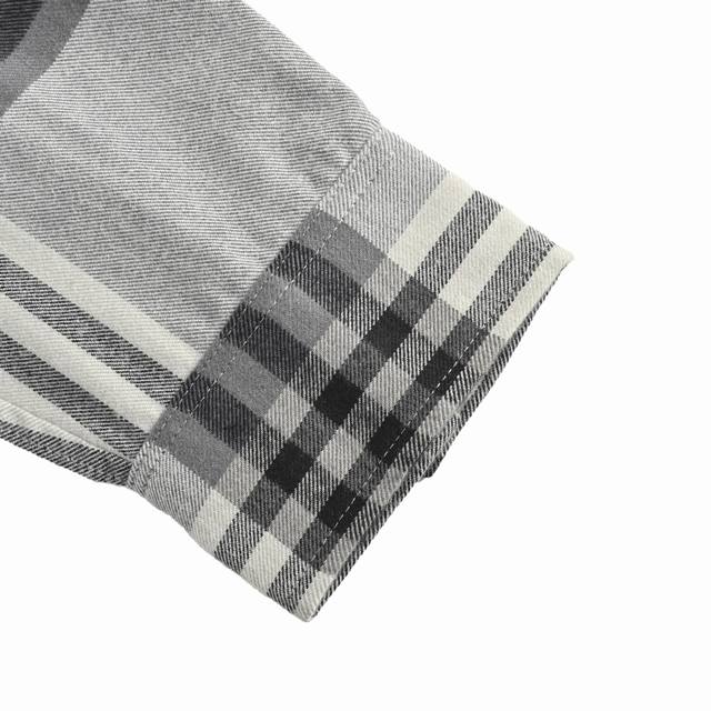 Custom-dyed all-cotton grey and black flannel fabric, post-processed with double-sided brushing. True to the original, with a heavyweight feel. Logo jacquard embellishments on the chest and back, with direct spraying from front to back. The left and right plaid patterns are matched, with the collar and sleeves aligned to ensure no errors. The sleeves have three loops, the back has four loops, and the collar is aligned, consistent with the original. Custom-edged logo-engraved buttons add a touch of luxury. Complete with three labels. Loose fit