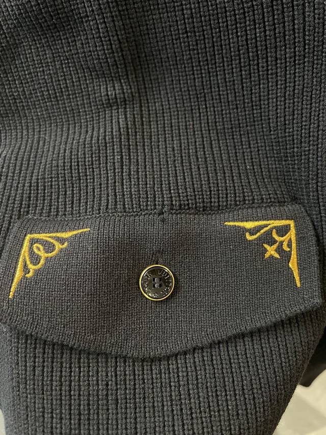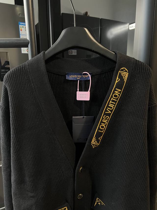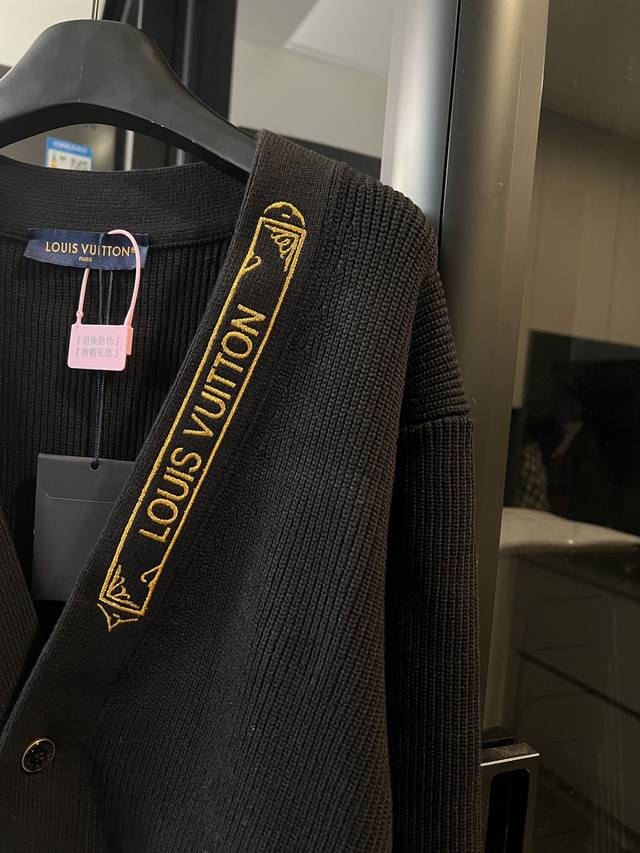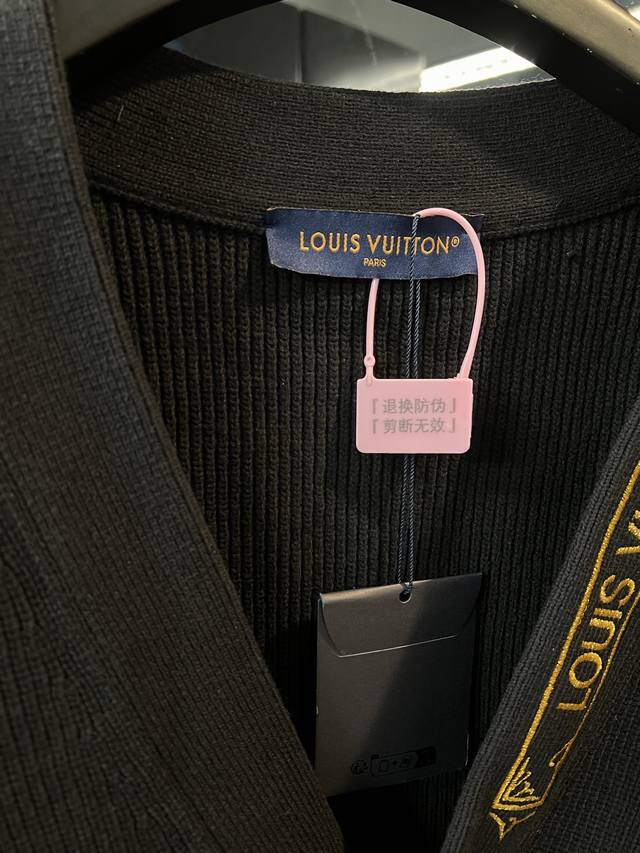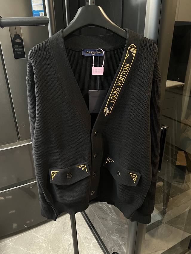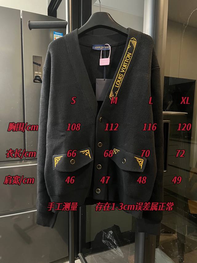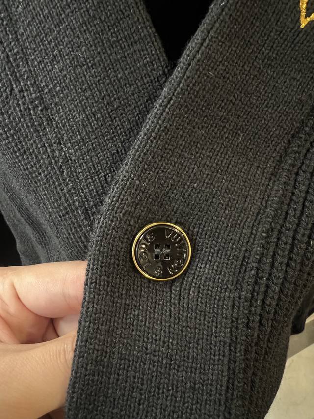 Louis Vuitton 25Fw Spring/Summer New Arrival Gold Thread Embroidery Jacquard Knit Cardigan Sweater Black. Fabric: 95% cotton, 5% wool. This garment is primarily made of cotton, with the 5% wool adding a touch of softness and support. It has a structured and flattering fit. Craftsmanship: 3D embroidery using custom-dyed gold thread, 5-needle stitch for a more three-dimensional effect on the lettering. Accessories: Buttons are alloy-plated inside and out, and the button face is engraved with the brand's iconic logo and four-leaf clover pattern for easy identification. Size: SML XL. See picture 9 for detailed size information.