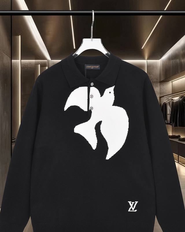 Louis Vuitton 25Fwlv Peace Dove Logo Jacquard Crew Neck Pullover Sweater 2025Fw Official New Original Fabric Official Same Style Selected Sweater Custom Imported Wool Blend Fabric High-end Version, Customized Fabric with Boutique, High Breathability and Comfort, Exquisite Craftsmanship, Perfect and Impeccable Details, Custom Logo Engraved Buttons, Complete Three Labels. Brand Elements Design Concept, Reflecting High Quality. Delicate and Soft to the Touch! Presents a Casual Cut, Superb Fit. Color: Black. Size: M-XL.