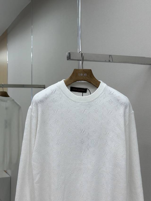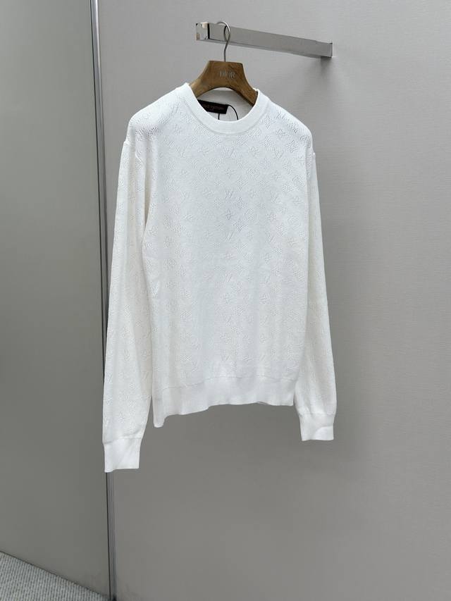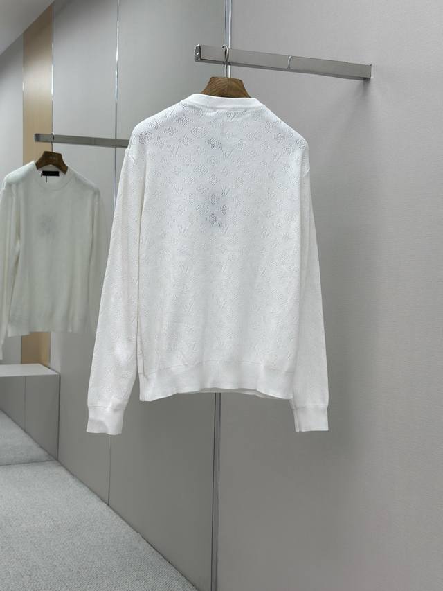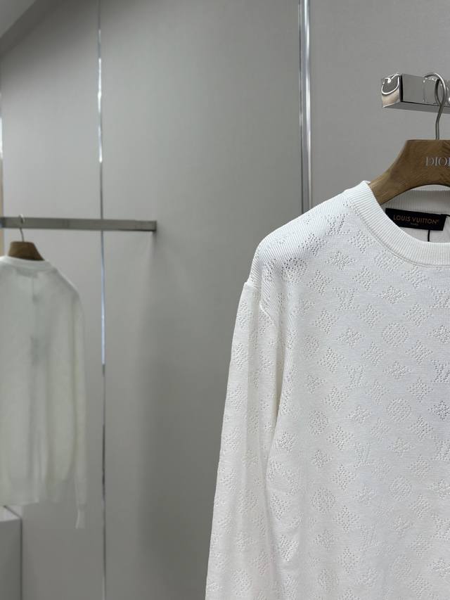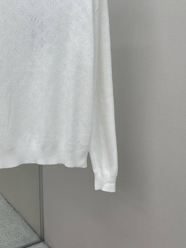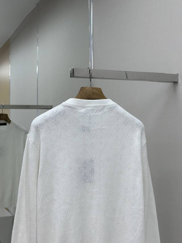 Louis Vuitton 25Ss Hollow-out Jacquard Crew Neck Long-Sleeve Sweater. Developed using yarn purchased from the original 12929. Made with high-quality off-white 80-count Sea Island cotton. This design can only be made with the highest grade yarn; otherwise, the overall density and logo detailing cannot be replicated to the original's craftsmanship. Knitted on an imported Stoll twill machine, every pattern and spacing is meticulously designed and adjusted by our pattern maker to perfectly reproduce every detail of the original. Each knitted piece must be perfectly aligned, with the front chest facing and upper sleeve seams completed with 20 stitches each. Size: SMLXL