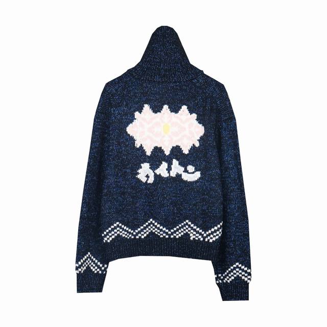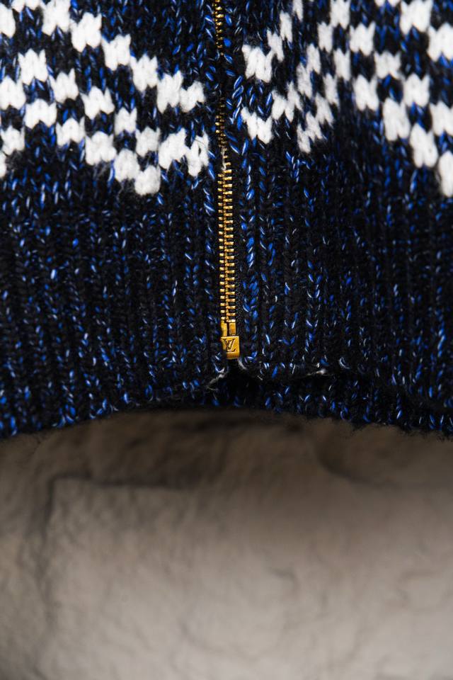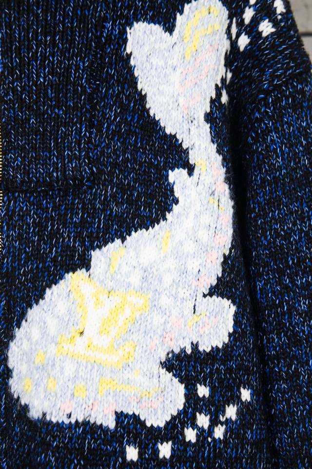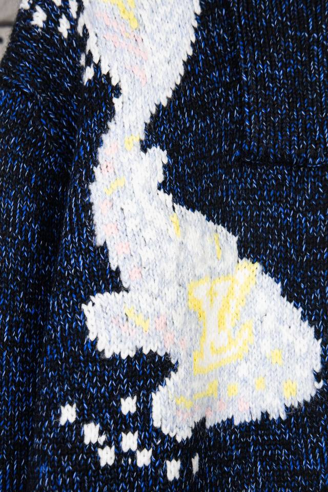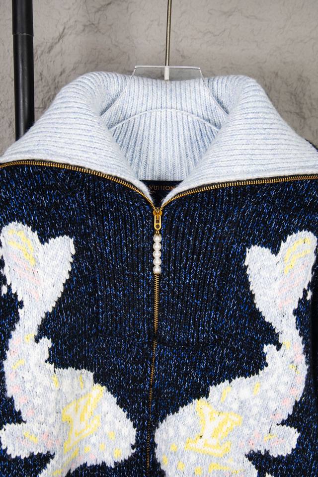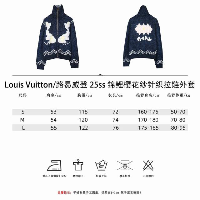 Louis Vuitton 25Ss Koi and Cherry Blossom Knit Zip-Up Jacket This belted jacket focuses on the creative vision shared by pharrell Williams and Nigo for Fall/Winter 2025. A koi carp adorned with the LV logo swims in the front, while cherry blossoms and Japanese lettering on the back reveal Nigo's cultural roots. The sophisticated pattern is presented in intarsia and embroidery techniques on a cotton-wool blend knit, with a delicate, handcrafted texture. A beaded zip-up pull adds an elegant touch to the comfortable silhouette. Sizes: S, M, L