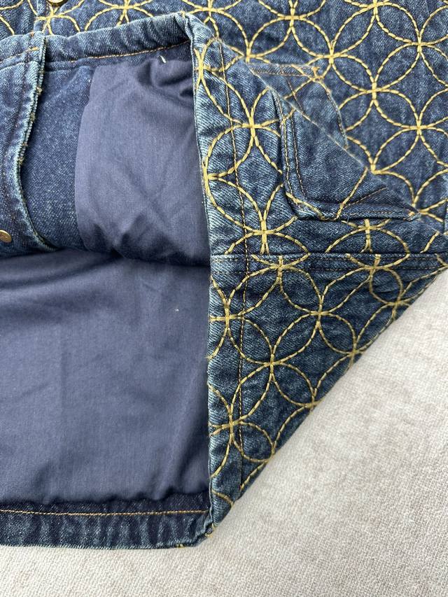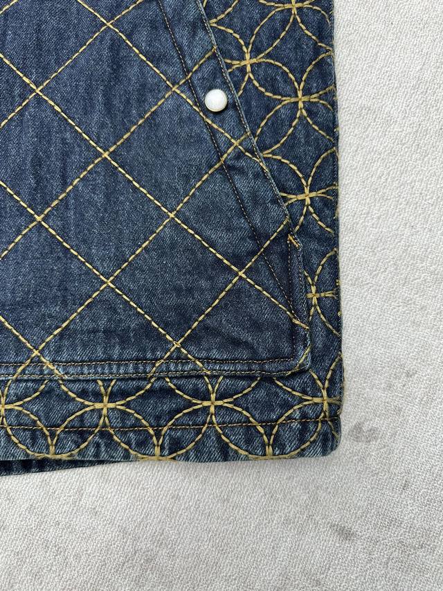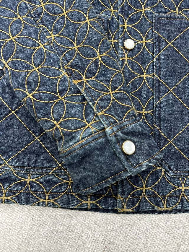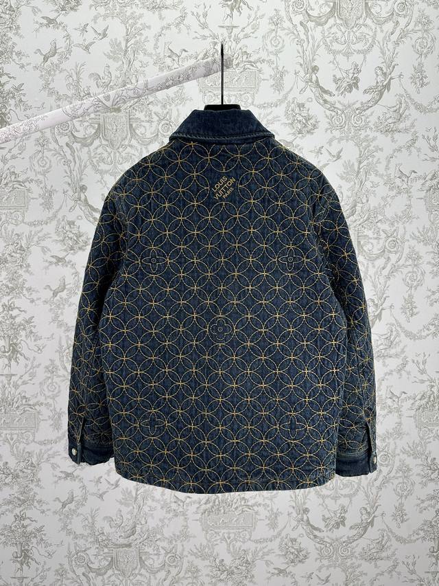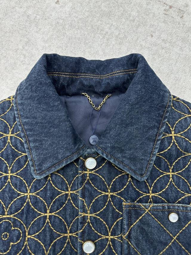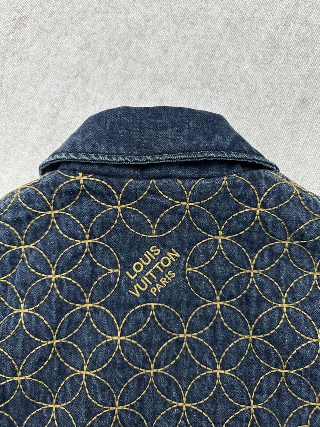 Louis Vuitton 25Ss New Embroidered Denim Belt Jacket. This denim workwear belt jacket is from the 2025 Fall/Winter collaboration between Pharell Williams and Nigo, showcasing the brand's exquisite craftsmanship. The full-width quilted Dandy Monogram pattern adorned with the Louis Vuitton logo reflects Nigo's Japanese aesthetic heritage. Pearlescent buttons exude elegance and pair perfectly with matching shorts. Sizes: 46, 48, 50, 52.