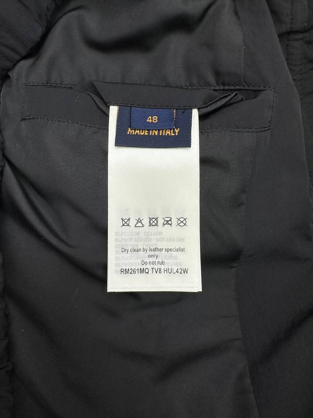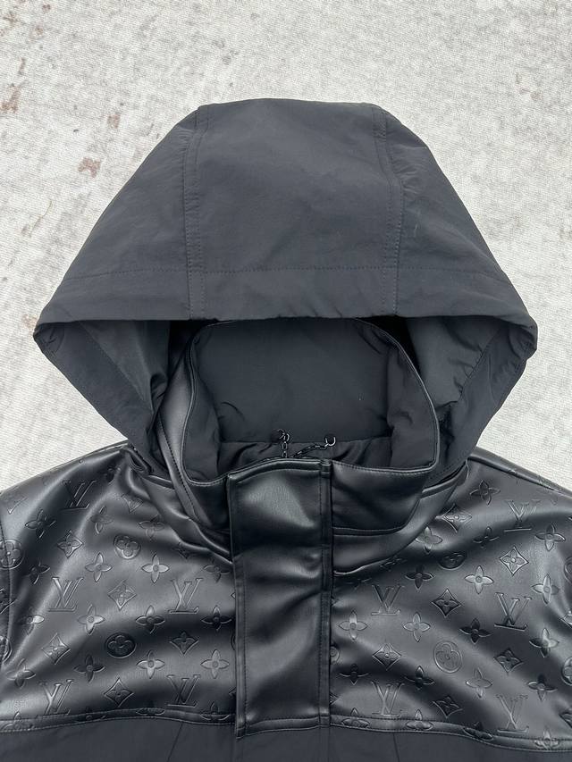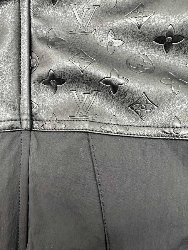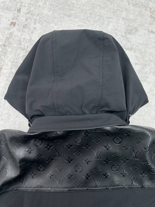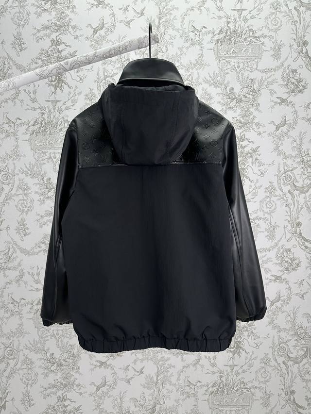 Louis Vuitton 25Ss New Mixed Leather Windbreaker. This windbreaker has been refreshed this season, cleverly blending a nylon blend with buttery-soft lambskin leather. Leather shoulder gussets feature a Monogram embossed logo, a leather stand-up collar concealing a foldable hood, and soft leather sleeves. An elastic hem and cuffs, along with large pockets, ensure both comfort and a stylish look. Sizes: 46, 48, 50, 52.