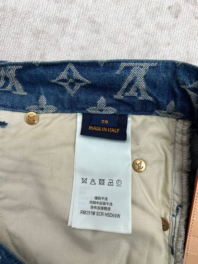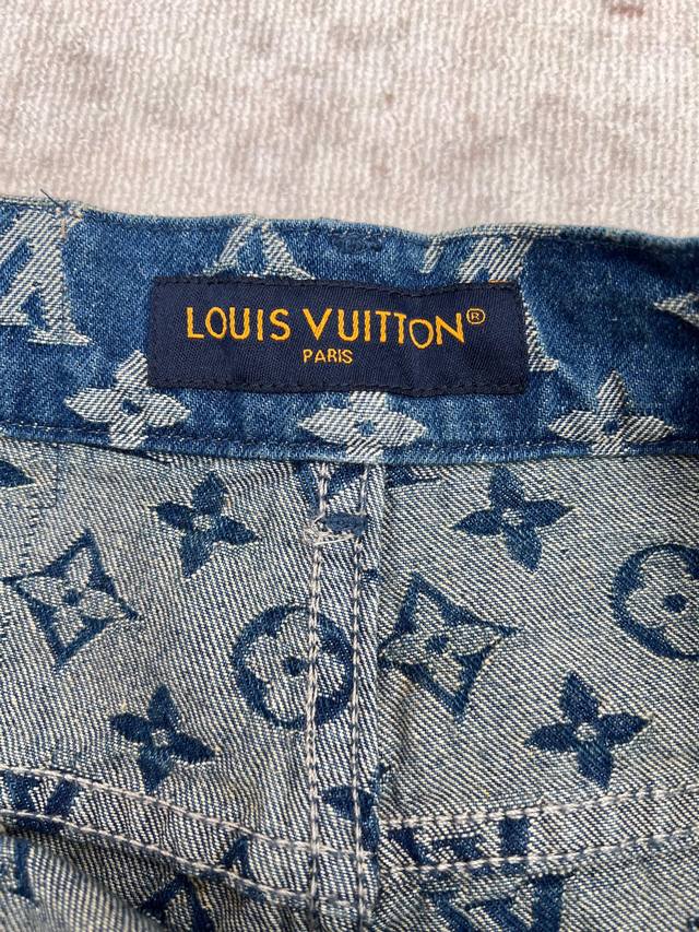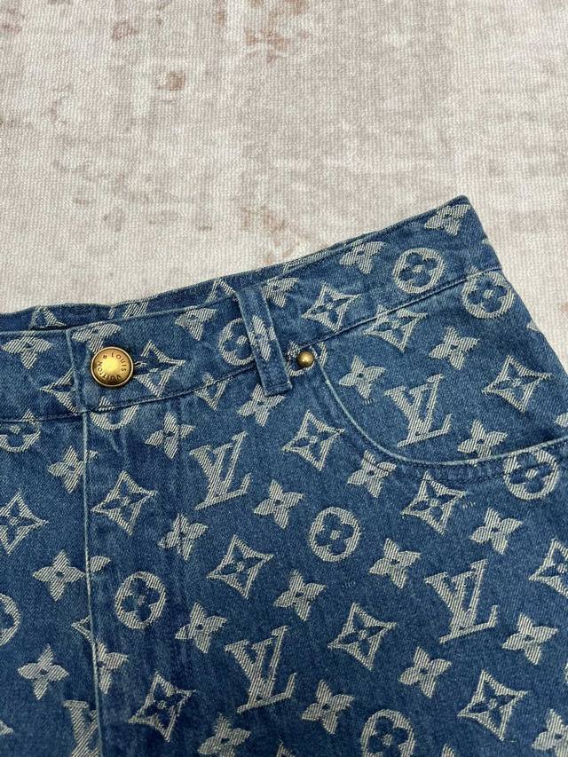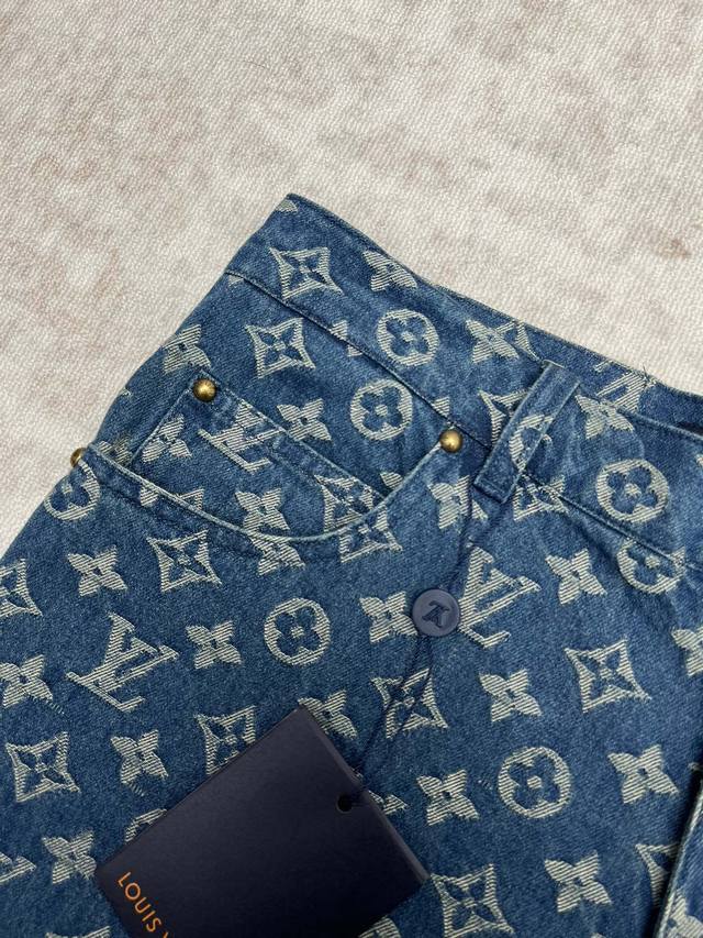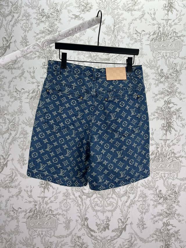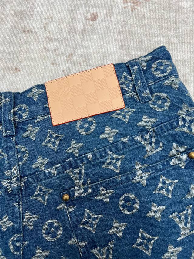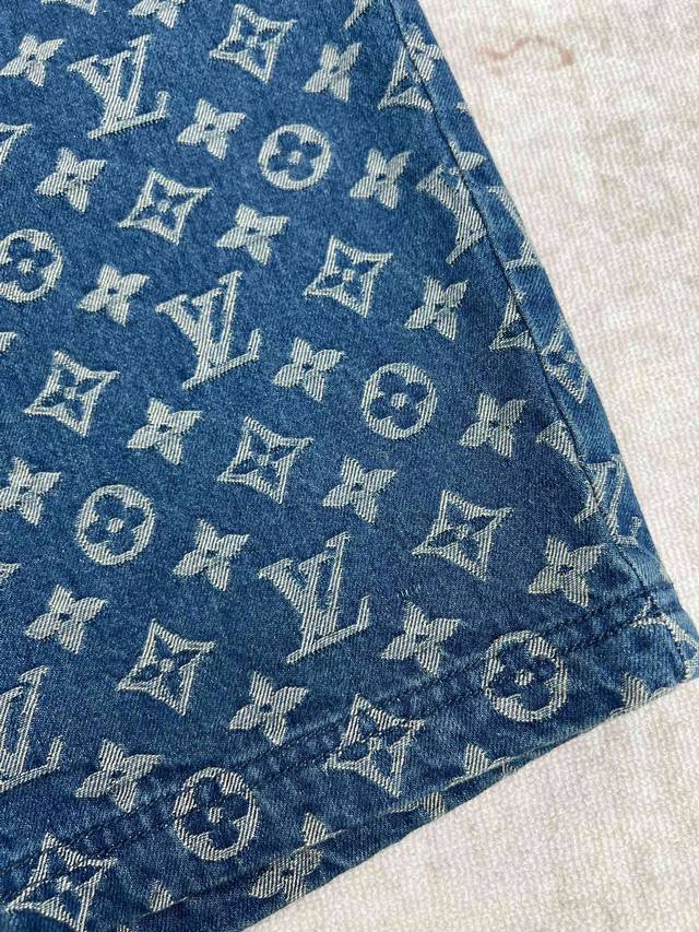 Louis Vuitton 25Ss New Monogram Denim Shorts. These denim shorts stand out with their fresh look and classic style. The tonal Monogram jacquard subtly unfolds on the medium-washed fabric, while the distinctive Damier leather tag cleverly echoes the brand's leather goods heritage. Easy to incorporate into everyday outfits, or wear as a set with the matching shirt. Sizes: 29, 30, 31, 32.