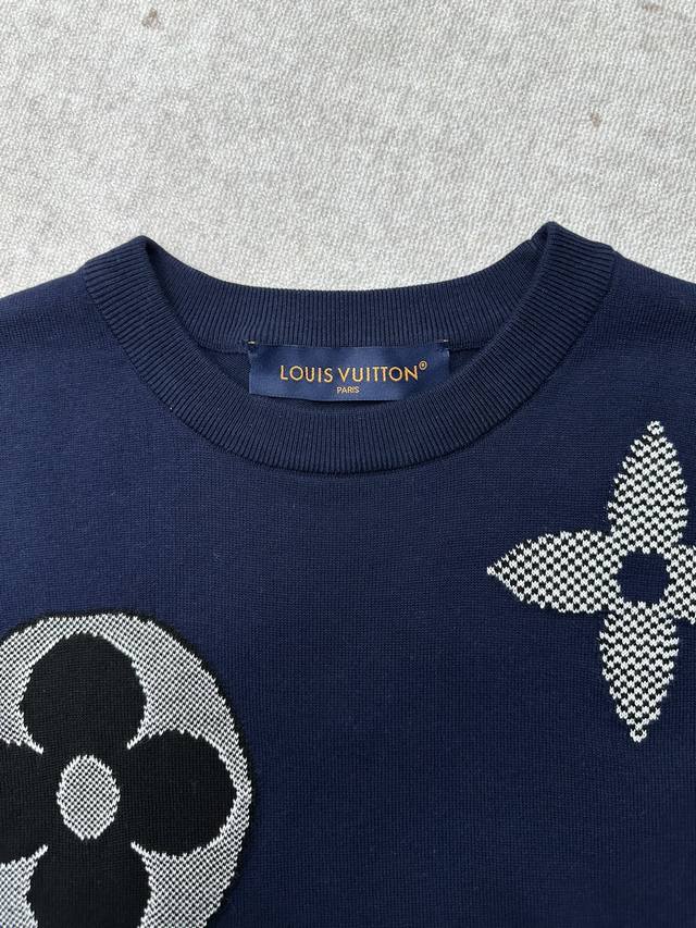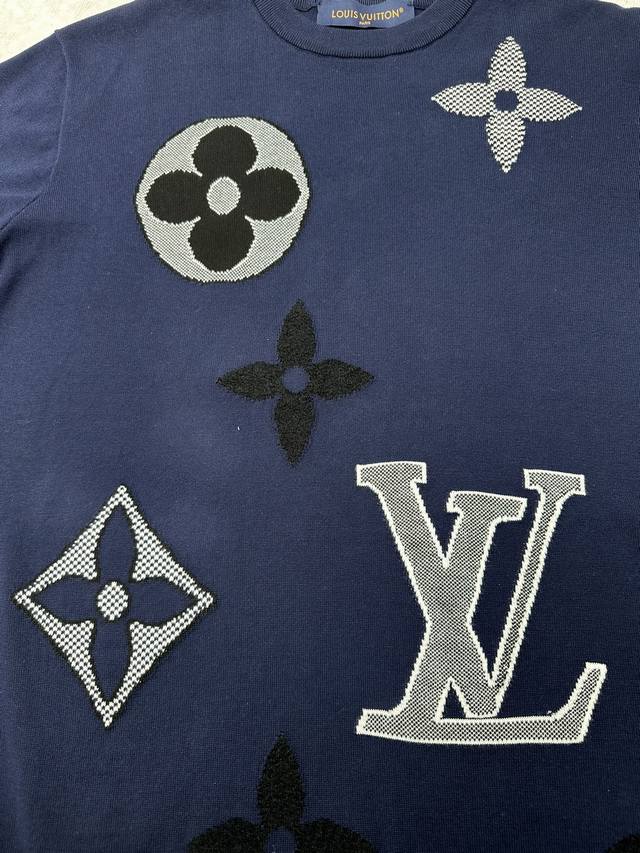 Louis Vuitton 25Ss New Monogram Short-Sleeve Crew Neck Knit Sweater. This short-sleeve crew neck sweater features a richly colored cotton blend body, adorned with intarsia patterns, large LV lettering, and Monogram flowers. Contrasting colors and varied stitching showcase the brand's exquisite craftsmanship. The eye-catching logo adds a touch of glamour to any look, and its relaxed style easily complements both outdoor and everyday outfits. Sizes: S, M, L, XL.
