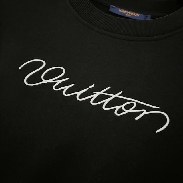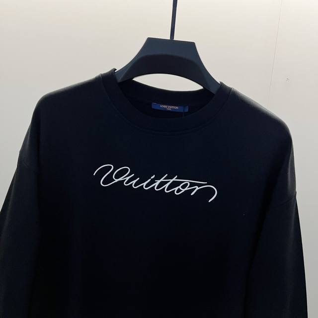 Louis Vuitton 420g 100% Cotton Crew Neck Sweatshirt. Features simple embroidered handwritten signature logo, high-quality official version, fashionable and versatile, original quality fabric, complete with hangtag, neck label, and wash label. Colors: Black, Apricot, Khaki. Sizes: XS-L.