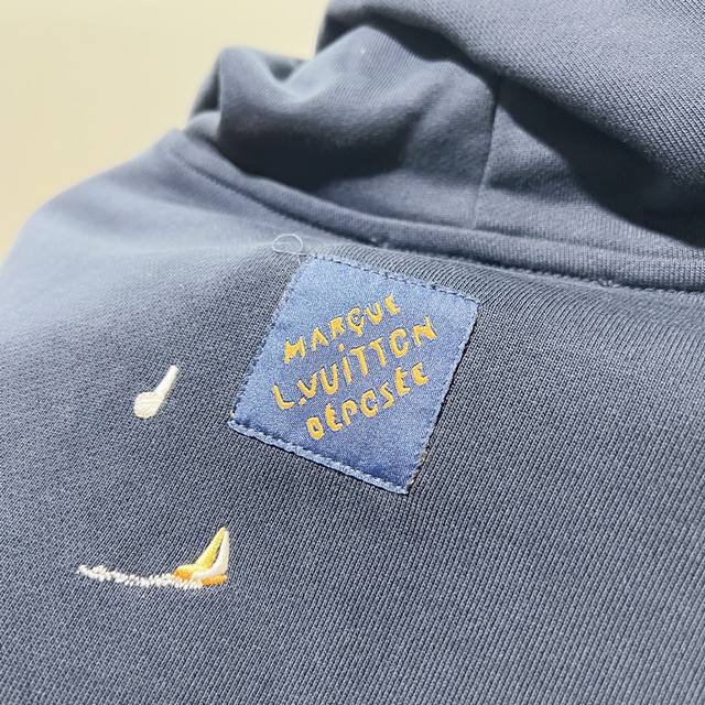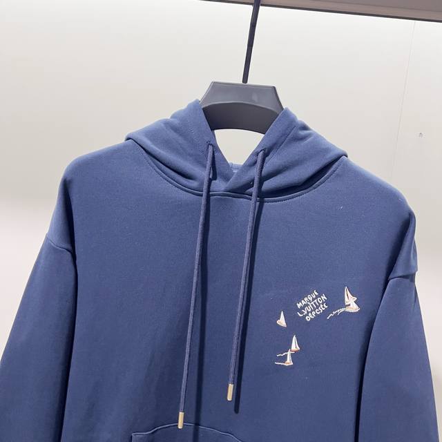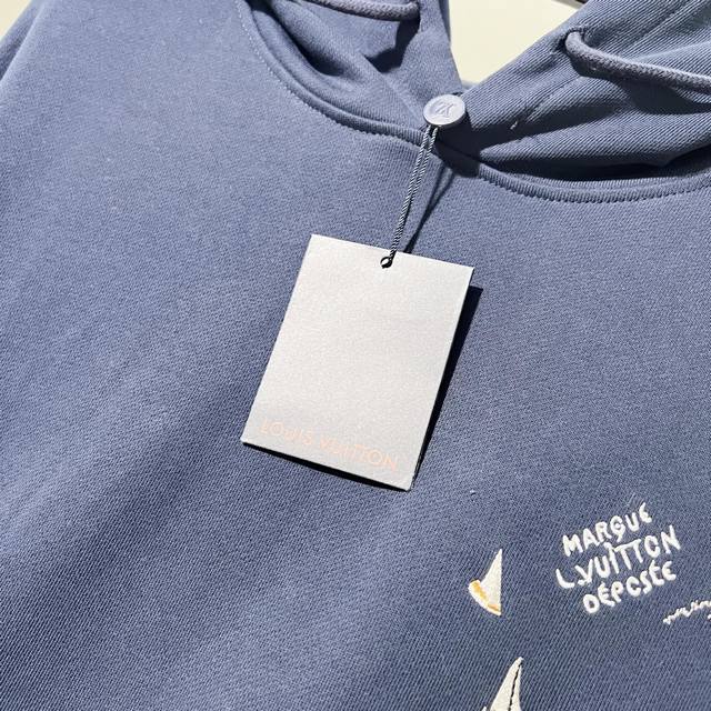 Louis Vuitton 420g 100% Cotton Hooded Sweatshirt. Features a small sailboat logo and embroidered lettering on the front and back. Officially synchronized high-quality version. Stylish, versatile, and trendy. Made with original fabric. Includes hangtag, neck label, and wash label. Colors: Royal Blue, Apricot. Sizes: XS-L.