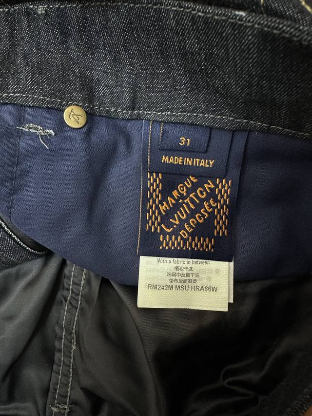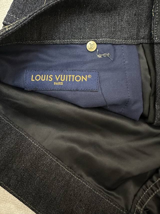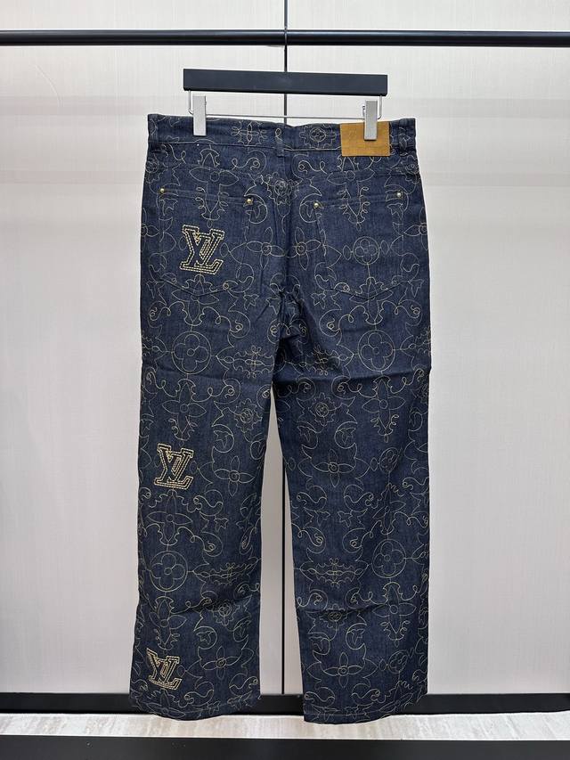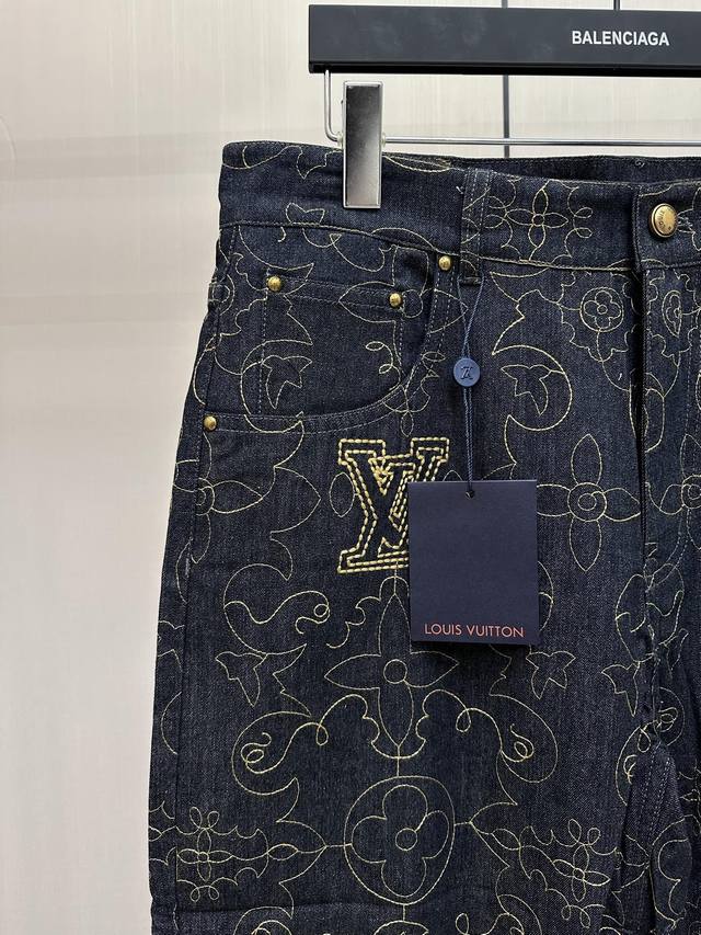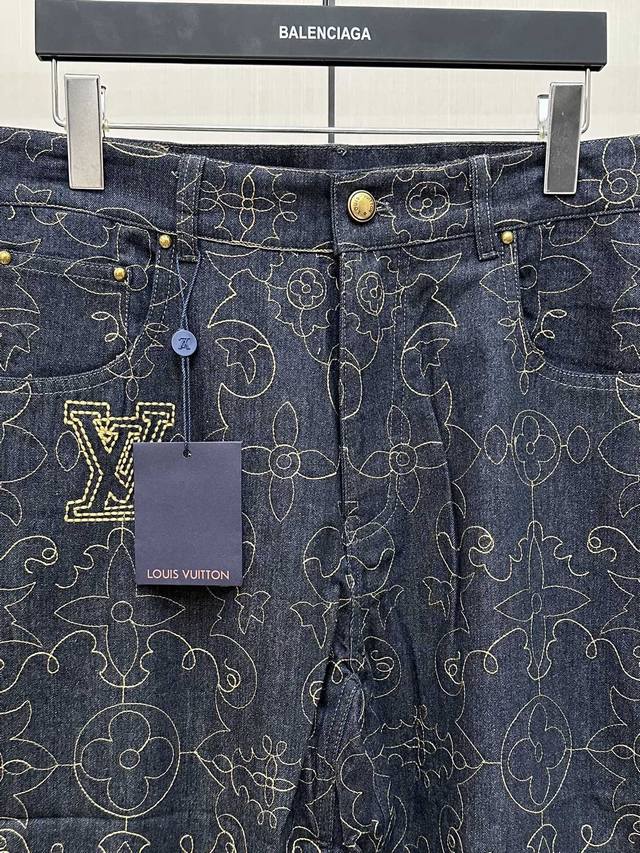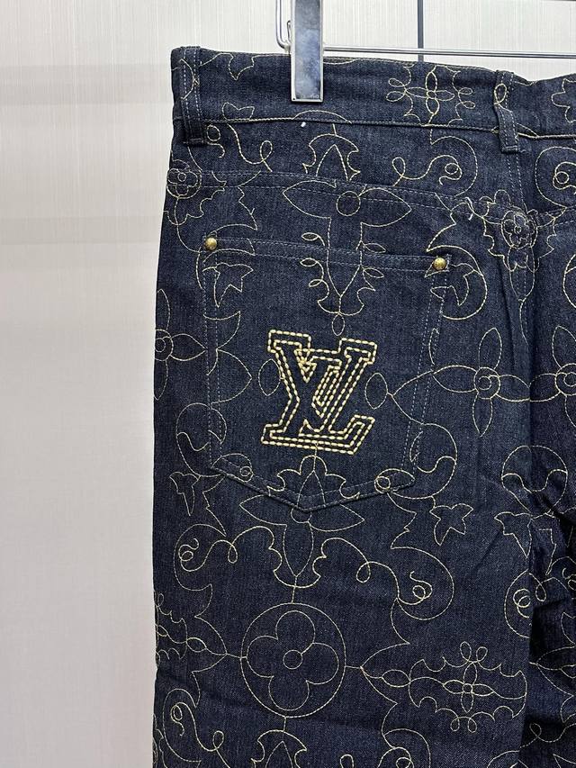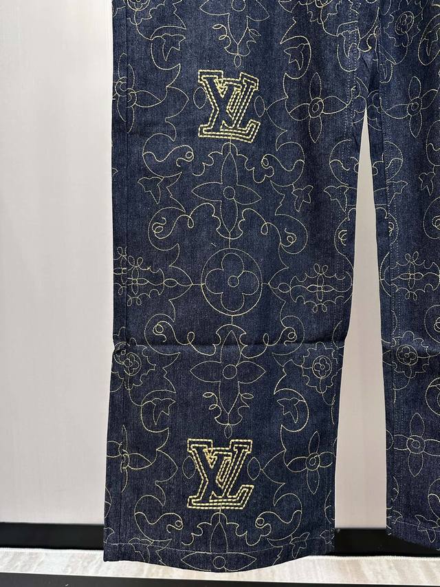 This style reinterprets the Monogram design with topstitching, featuring the 1V Arabesque motif from the Fall/Winter runway embroidered in contrasting yarn. The pockets and hem exude a romantic Western vibe. Complement your look with matching jeans. This regular fit features all-over 1V Arabesque embroidery, a Damier nubuck label, and a classic five-pocket silhouette. It's 100% cotton and is unisex.