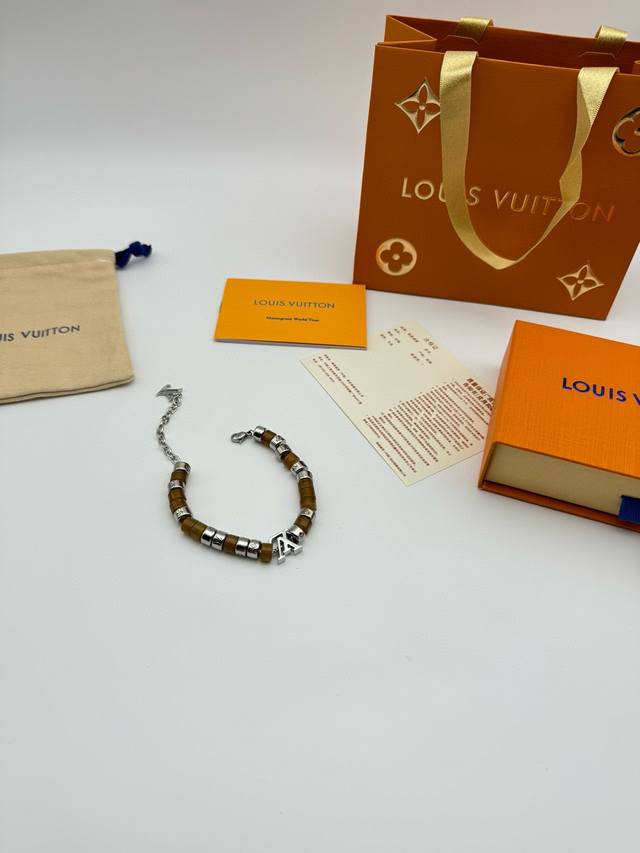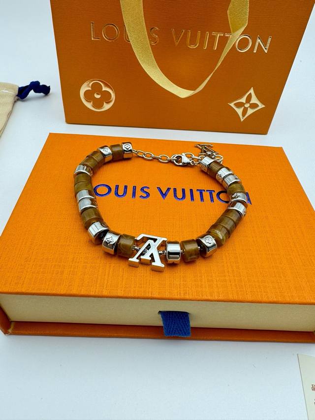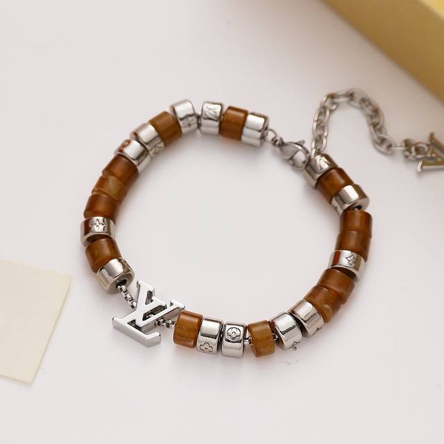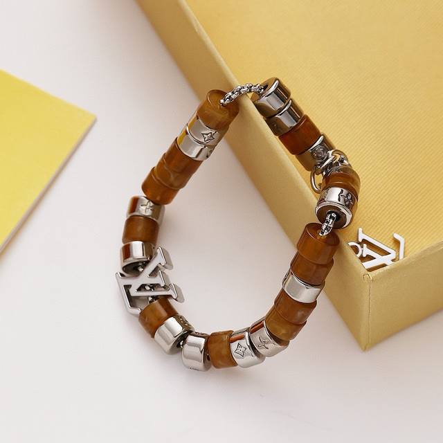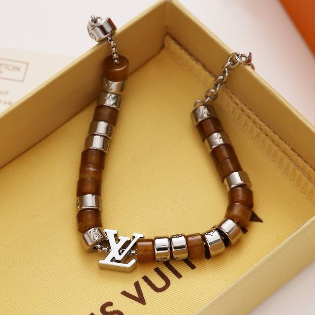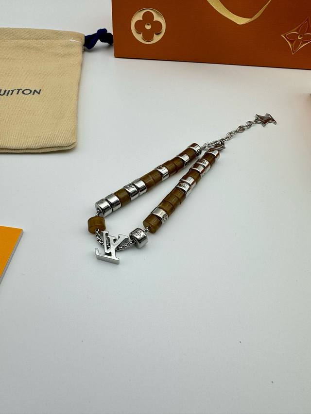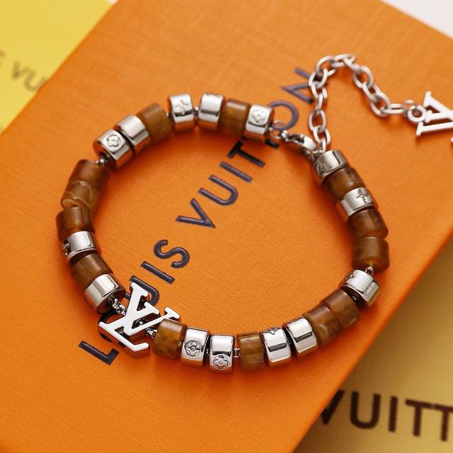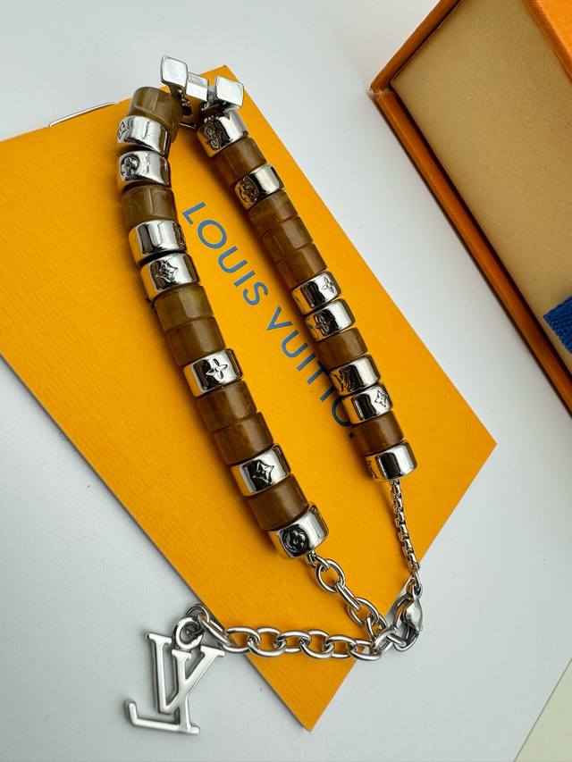 Louis Vuitton Brown Beaded Bracelet with Full Packaging. The Louis Vuitton Paradise bracelet showcases the fusion of resin and metal beads through meticulous craftsmanship, symbolizing a free and unrestrained spirit. The metal links are engraved with the Monogram pattern, and the adjustable cotton cord ensures comfortable wear, adding a touch of brilliance to any outfit. Detailed Features: Adjustable; Stainless Steel, Resin; Monogram Pattern Engraved Links; Engraved Louis Vuitton Letters.