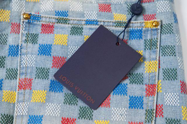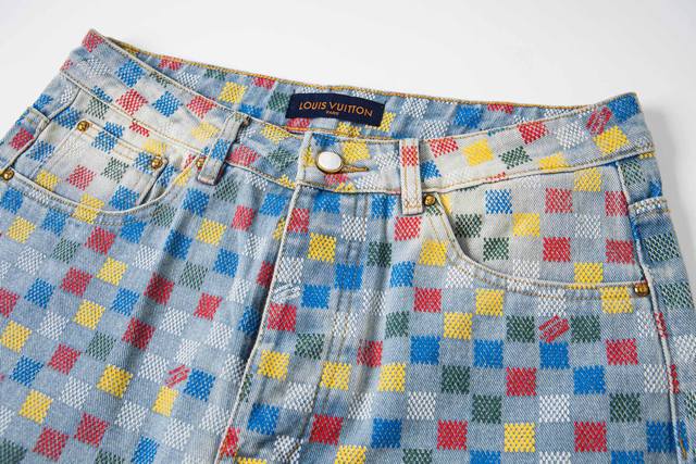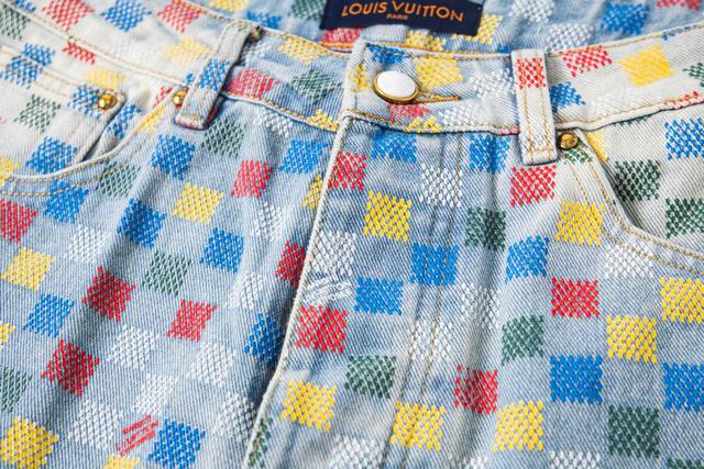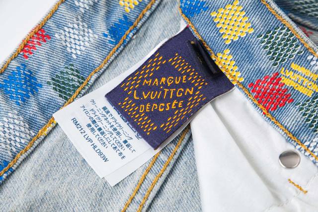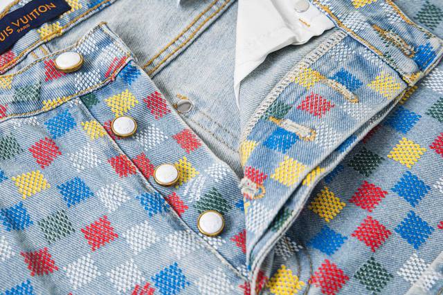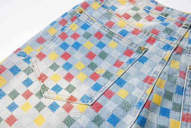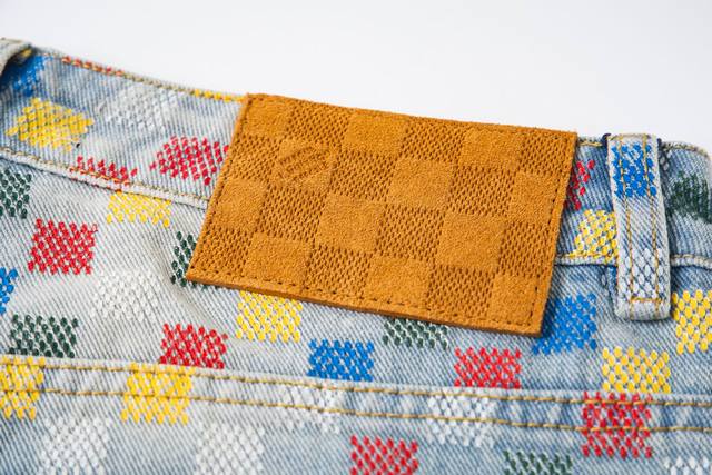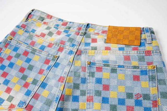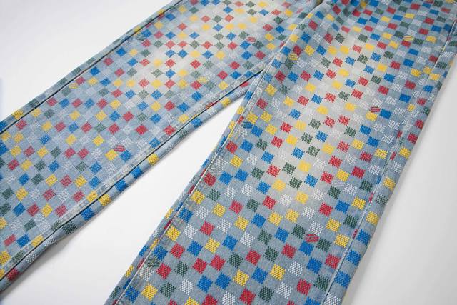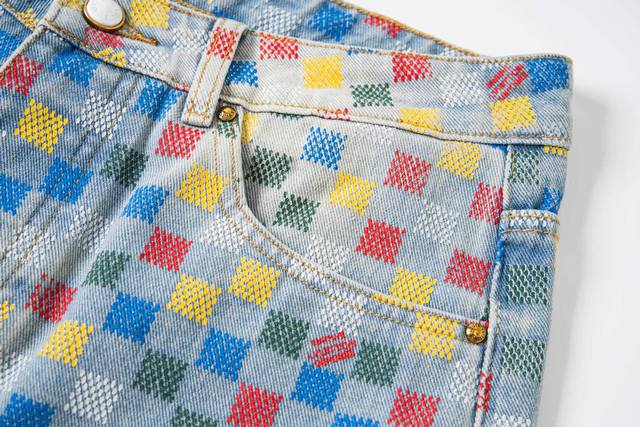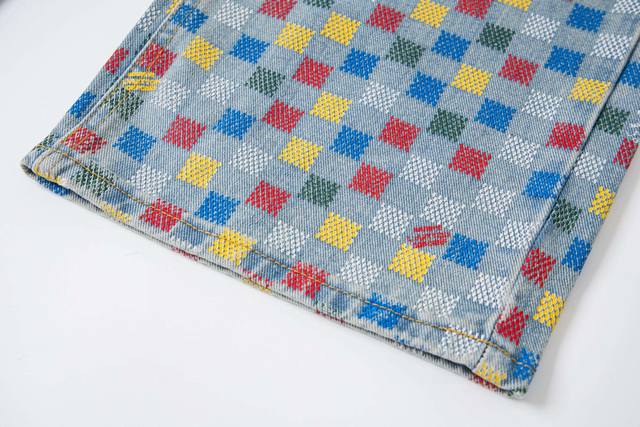 . Originally purchased for 18,700, these jeans are crafted from heavyweight twill denim with a colorful checkered jacquard pattern. The fabric is inset with matching material throughout, including the pockets. The back suede patch features a high-heat-stamped checkerboard pattern. The pearl buckle is custom-made with a pure copper base and comes with all three standard logos.