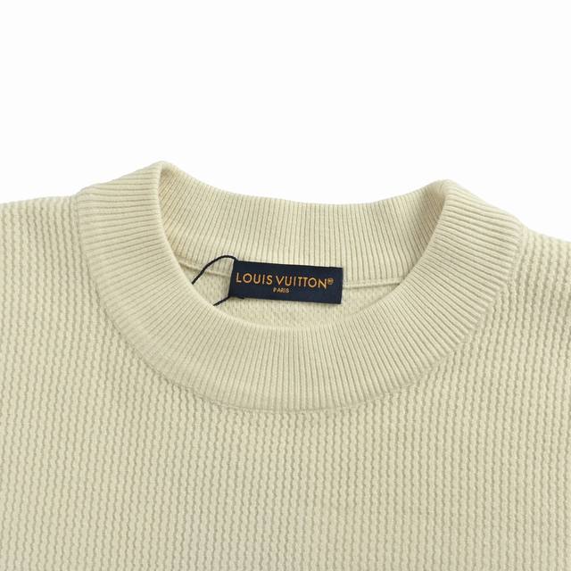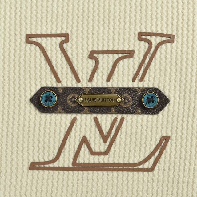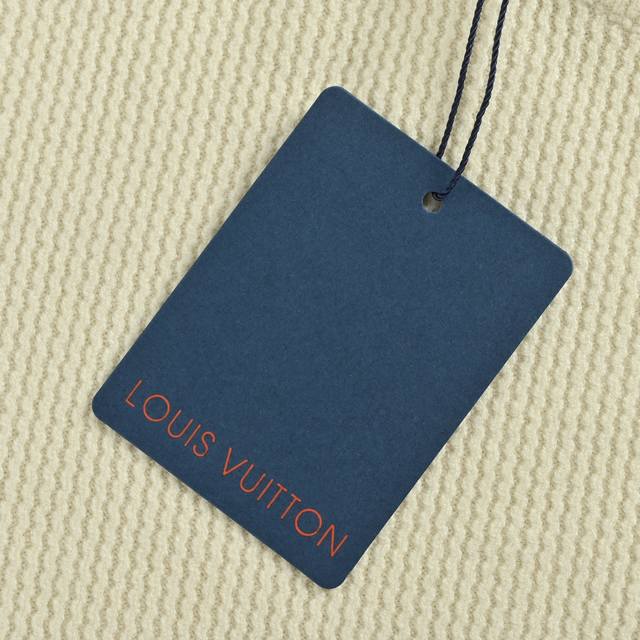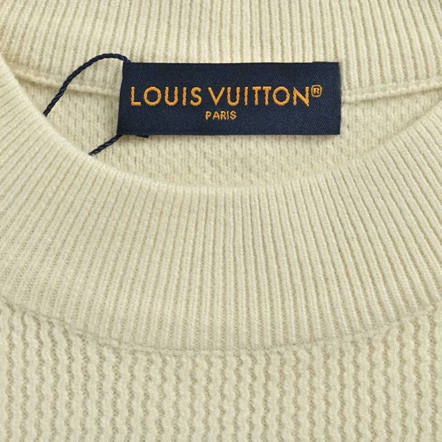 Louis Vuitton Crew Neck Sweater with Monogram Leather Tag on Chest. This new LV sweater features a soft, comfortable knit that feels gentle against the skin. The relaxed fit flatters all body types. Made from sun-kissed long-staple cotton, the yarn is combed for a comfortable and breathable feel. The napped finish adds a fine peach-skin texture, permanently capturing the texture of sunlight on the fabric. The laser-cut LV leather embellishment on the chest combines Louis Vuitton's classic monogram with turquoise accents, showcasing the brand's luxurious heritage while incorporating a natural and artistic touch. The high-quality turquoise, ideally in a "robin's egg blue," is accented with metal buckles. The natural texture of the turquoise buttons contrasts with the geometric pattern of the monogram, enhancing the visual depth. Size: M-XL
