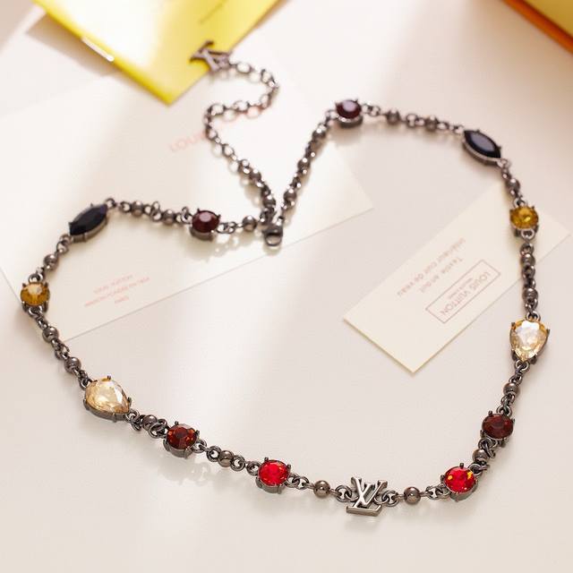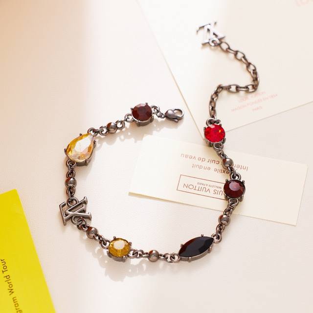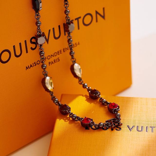 Louis Vuitton diamond bracelet and necklace with full packaging. The Louis Vuitton Light bracelet features large round-cut cubic zirconia stones set in a metal chain, its vibrant colors echoing the seasonal ready-to-wear collection. The Louis Vuitton logo adorns the adjustable chain. Metal hardware, cubic zirconia stones.
