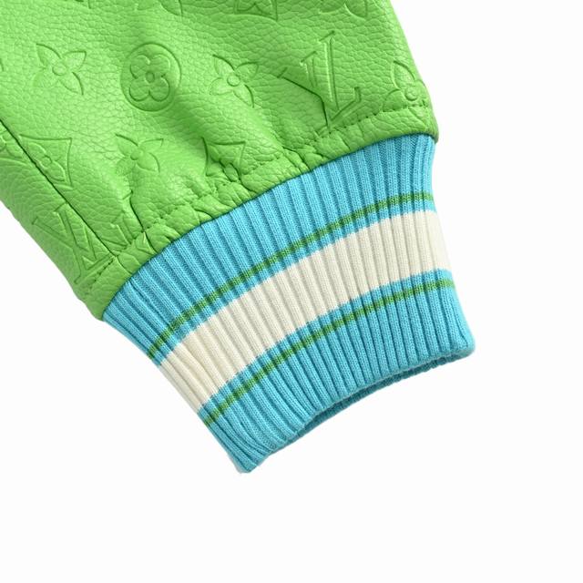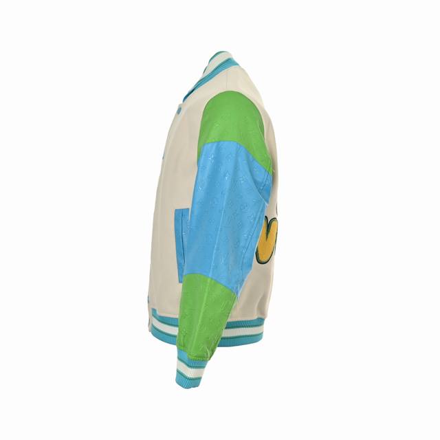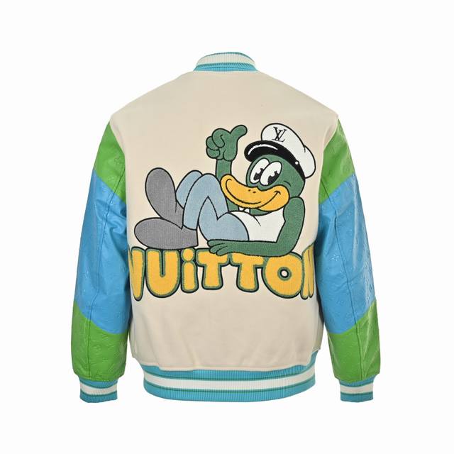 . This baseball jacket features a multi-color design that exudes a spring-inspired vibe. The collar and hem feature a custom blue and white threaded design, while the sleeves are made of leather with a blue and green embossed pattern. The chest is adorned with a green and yellow contrasting Lv logo, and the back is heavily flocked with Donald Duck, adding a playful, cartoon-like touch. The entire garment is made primarily of wool tweed, providing excellent warmth. The novel design creates a youthful look. Available in stock and shipped instantly. Unisex styles. Sizes: S-Xl
