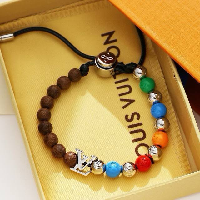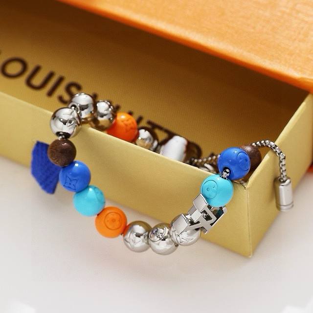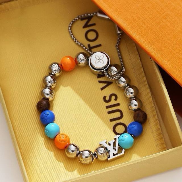Louis Vuitton Embossed Bead Bracelet in Color Blocks with Full Packaging. The Louis Vuitton Beads bracelet exudes playfulness with its multiple materials and vibrant colors. The letter LV is incorporated into the charms and engravings on the polished metal beads, while the resin beads offer a delicate luster. The slim design is perfect for layering with other bracelets. Detailed Features: Metal, Resin, Engraved Louis Vuitton Letters, Adjustable, Silver Cord, Color Block, Black Cord