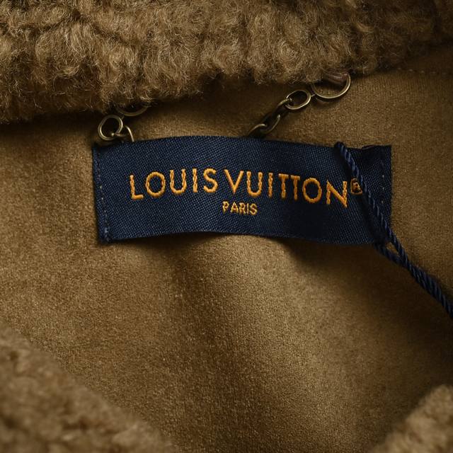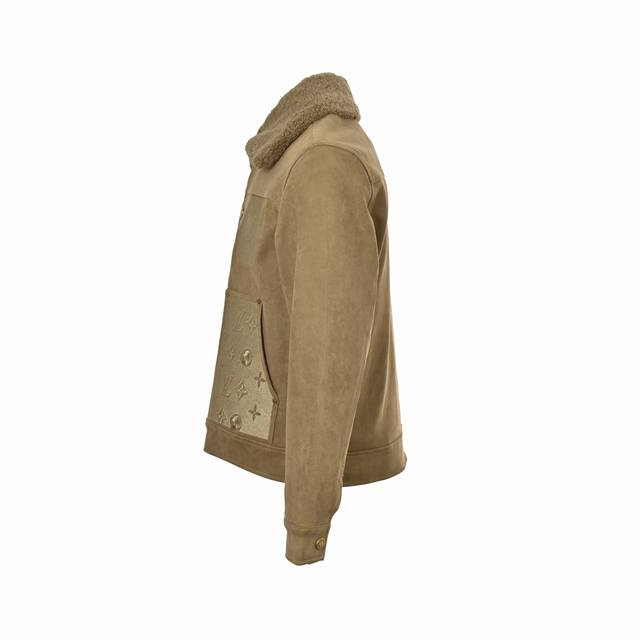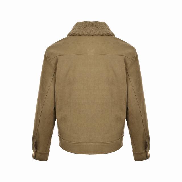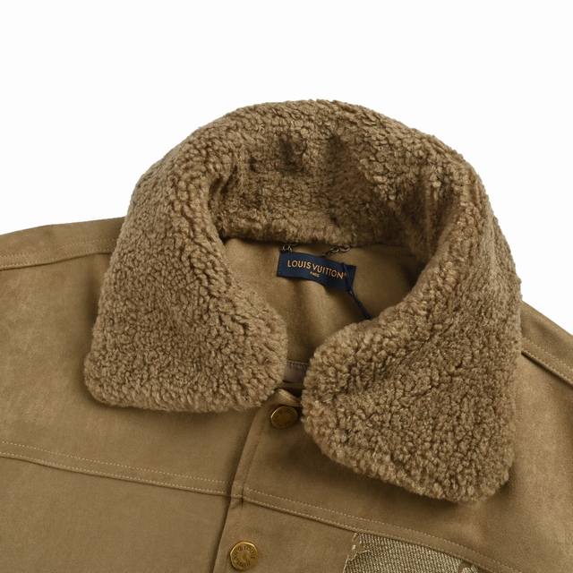 Louis Vuitton Embossed Suede Jacket with Fur Collar (originally purchased for 26,800). The fabric is a 480g thick twill denim made from 7*7 count combed Siro yarn. It features a concealed button closure with lettering under the front placket. The front panel incorporates Monogram pockets into a relaxed workwear silhouette. The jacquard details are perfectly aligned, and the embossed pattern is clear. Two sets of aluminum molds were used for each embossed pattern, and one mold was used for each size of the embossed pattern on the two sides of the front panel. After high-temperature pressing, each pattern was manually filled with silicone to prevent dents. The washing process combines multiple techniques, including heavy fermentation washing and dyeing, and spraying with monkey paint. It features a classic denim lapel design, a straight hem, and all accessories, zippers, and hardware are custom-made with a matching antique bronze finish. The interior lining is custom-made with patches, and the collar is a detachable high-quality sheepskin collar, ensuring perfect consistency. Size: Xs-L