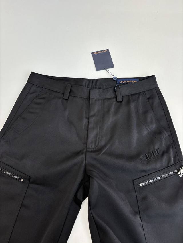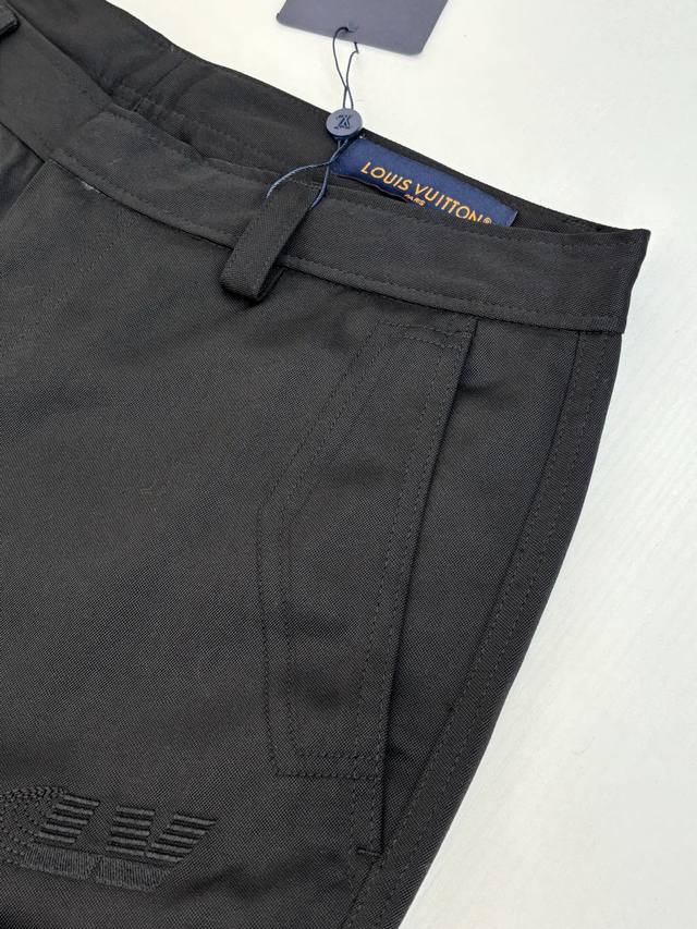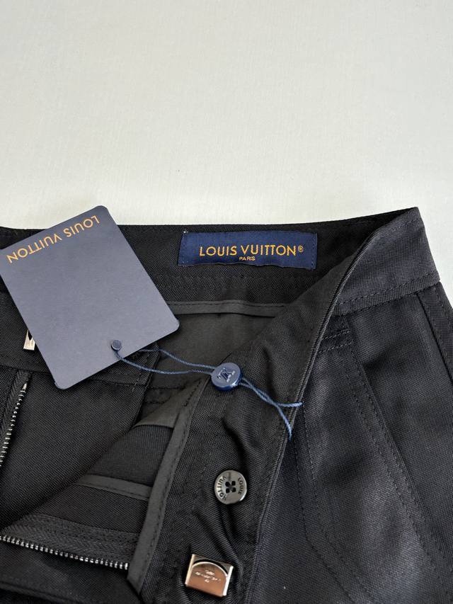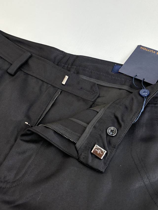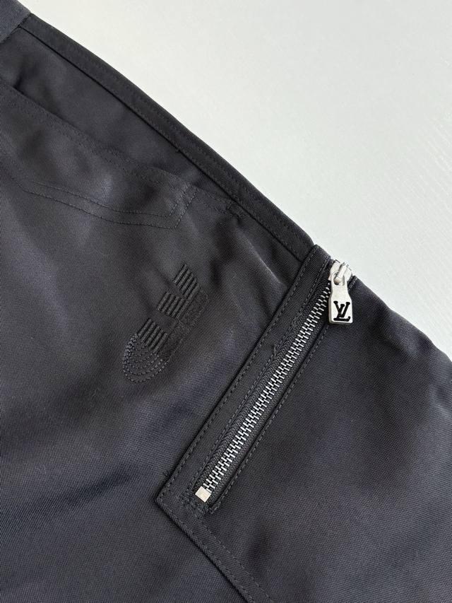 ) Custom-made premium wool satin woven body-shaping, 20-year-old traditional trousers craftsmanship, returning to traditional techniques through segmentation, folding, gathering, and stretching. The saying "slow and steady wins the race" reflects respect for materials and a pursuit of a refined feel. The workmanship is complex, time-consuming, and prone to waste. Imported machine embroidery technology is used, employing advanced computer control systems and precision mechanical parts to achieve high precision in the Louis Vuitton logo embroidery, resulting in smooth and delicate lines. (