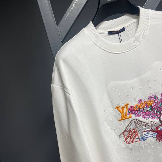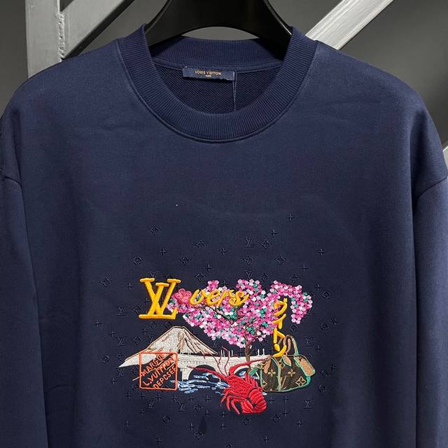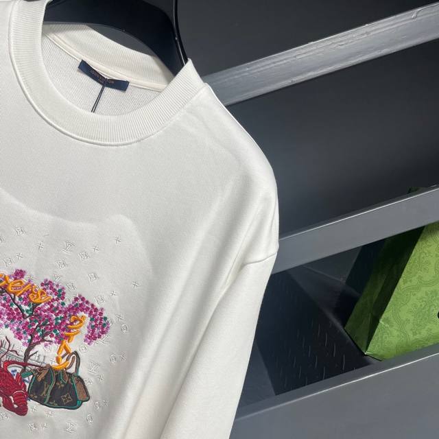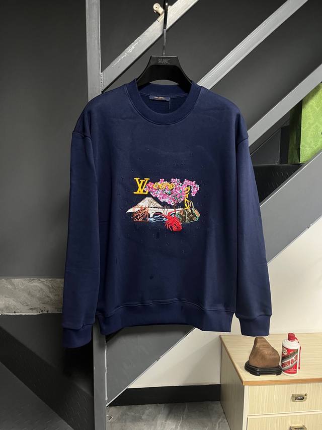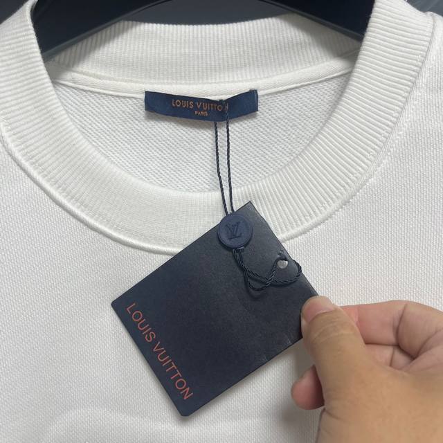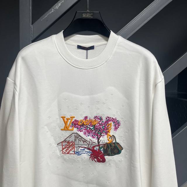 Louis Vuitton heavy-duty embroidery, exquisitely upgraded logo, inspired by 1980s retro style. Original fabric, official same style crew neck sweatshirt. Same dyeing process, very comfortable to the touch, 450g weight. Latest brick store style, fashionable and unique, super versatile and good-looking, suitable for both men and women, a must-have. Complete with hangtag, neck label, wash label, and three tags. Colors: White, Royal Blue. Sizes: S, M, XL.