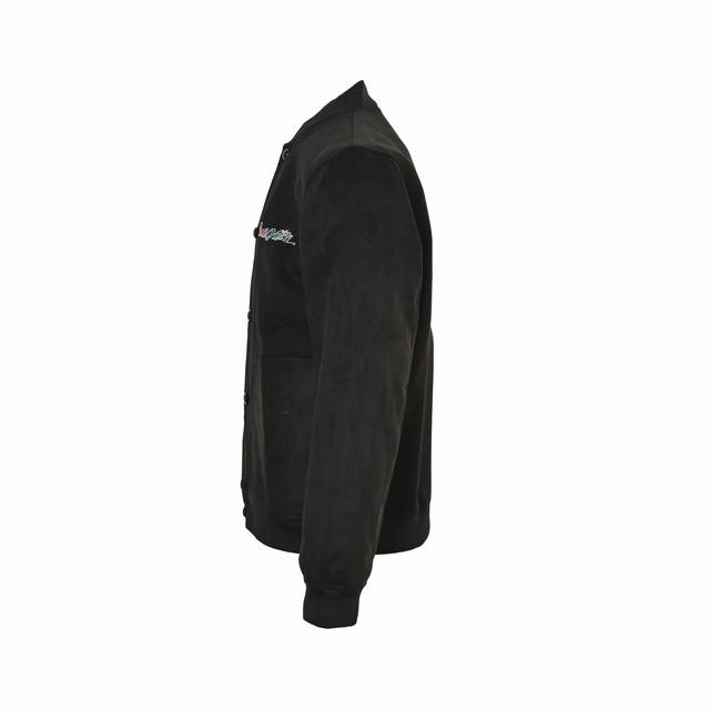 This tunic-style baseball jacket exudes elegance in a deep hue. The refined silhouette is crafted from sheep's wool, creating a contrasting texture with the nubuck sleeves and pockets. The handwritten Louis Vuitton signature adds a gradient to the chest, while a large Monogram flower and pearlescent logo are embroidered on the back.