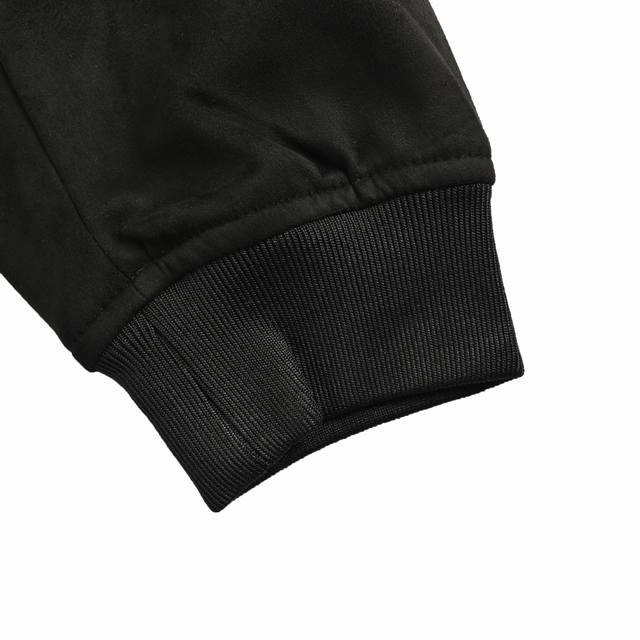 Regular fit, 50% goat leather, 50% sheep's wool, with ribbed cuffs, hem, and collar, and nubuck sleeves. Sheep's wool body. Fully lined, with a snap button front, nubuck patch pockets, and logo accents at the front and back.