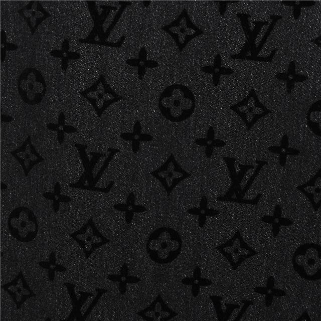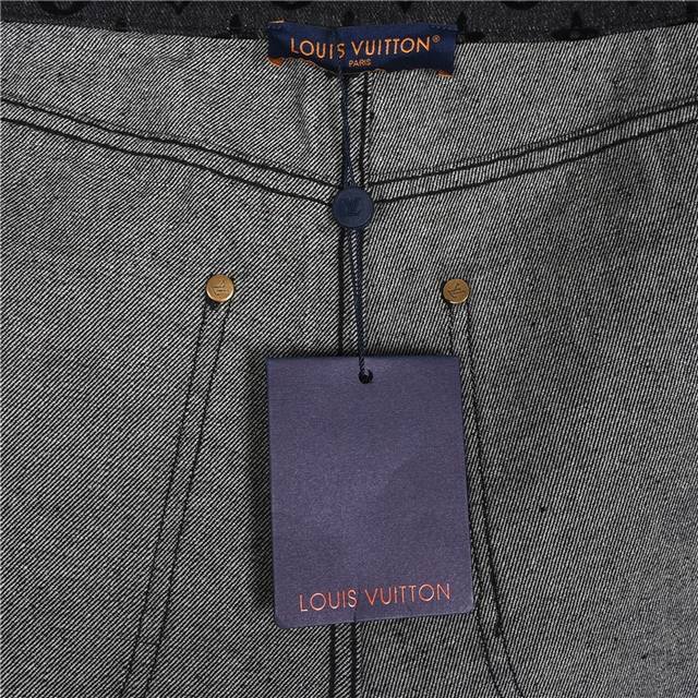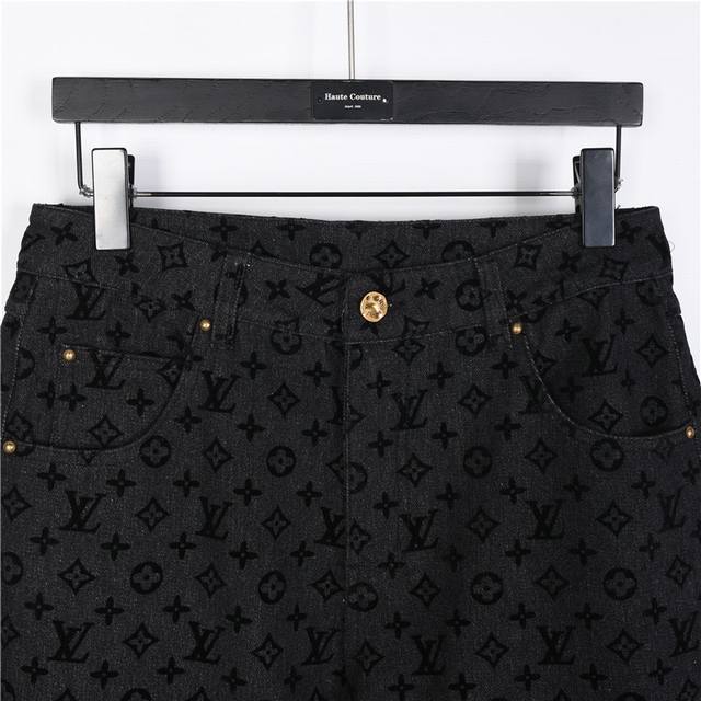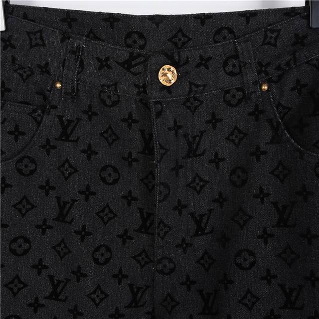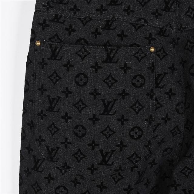 Louis Vuitton logo-embellished flocked denim trousers. The fabric is exceptionally high-quality, undergoing four rigorous washing processes to achieve a feel comparable to department store items. The fabric quality is immediately apparent, with impeccable details and meticulous craftsmanship. The tailored fit is sharp and sophisticated, flattering on both men and women. Custom hardware accessories, unisex style. Size: S-XL.