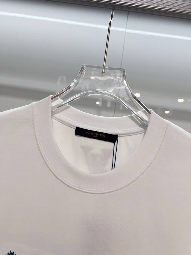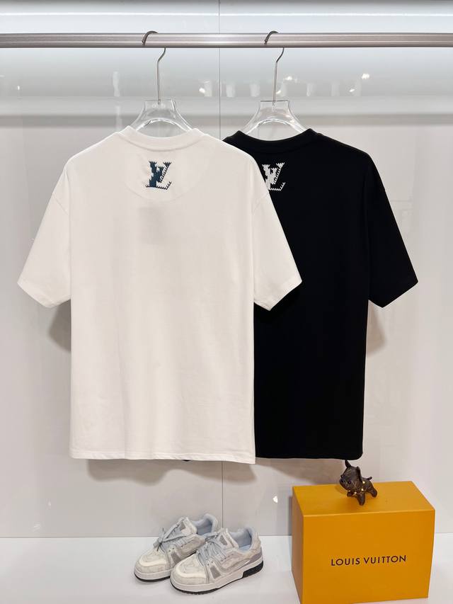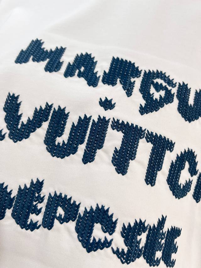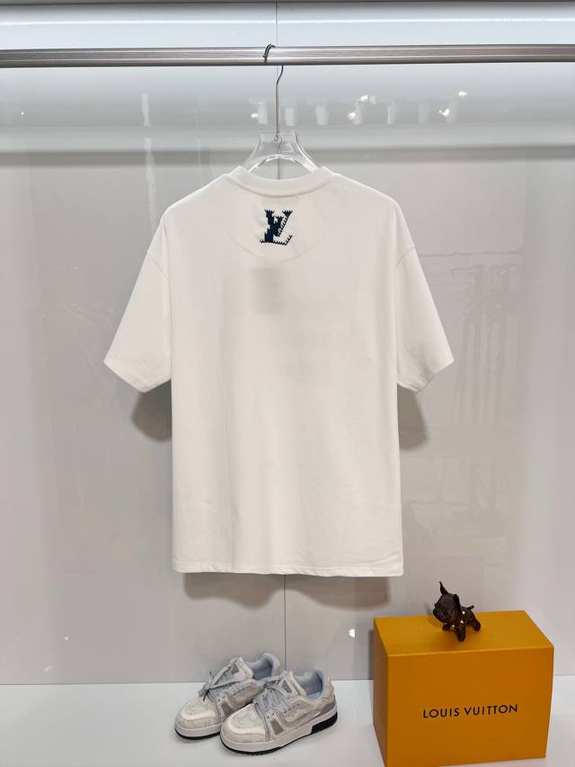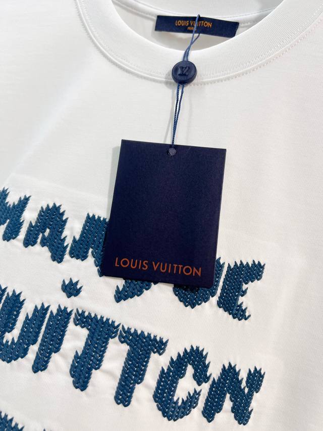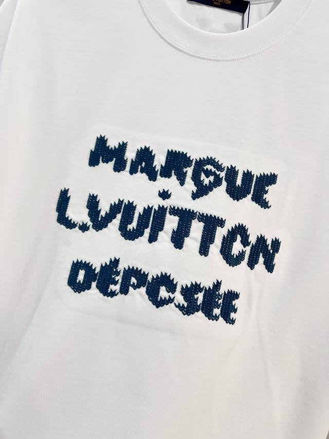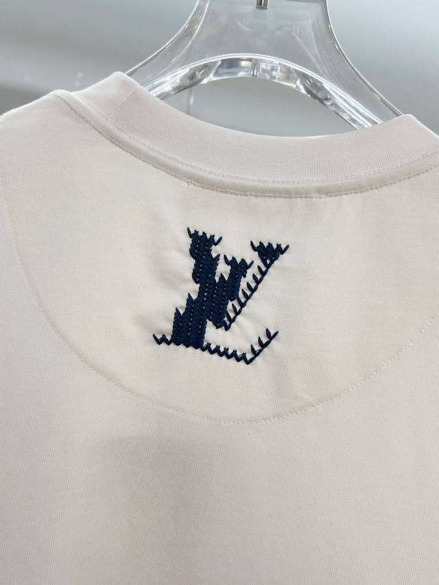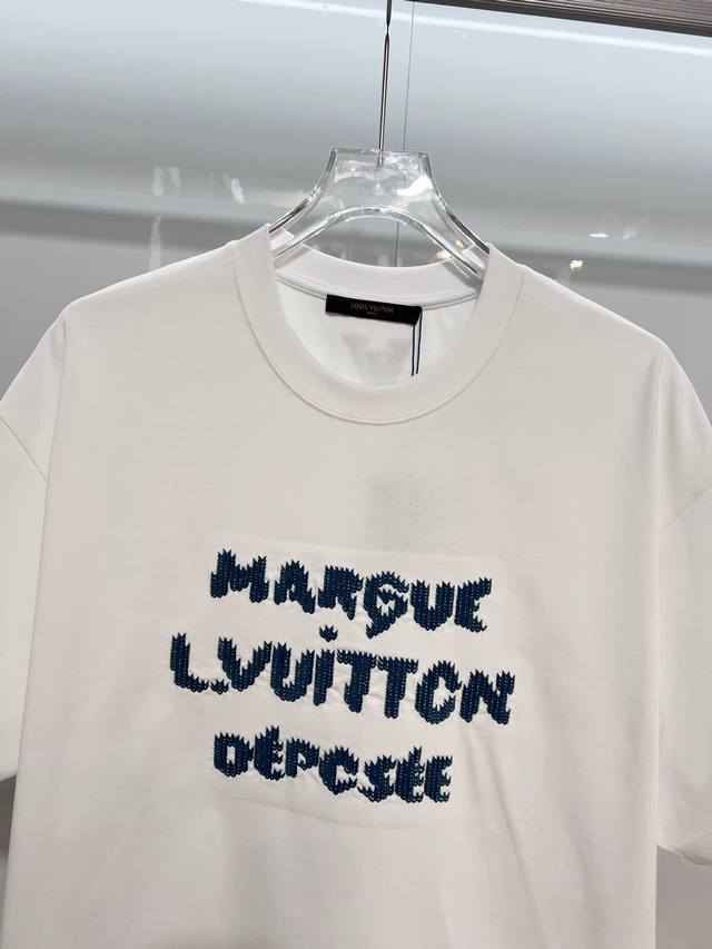 Louis Vuitton LV 2026 New Cross-Stitch Logo Letter T-Shirt for Men and Women, Custom 320g 100% Double Yarn Pure Cotton Fabric, Custom Dyed 32-Count Double-Strand Ribbed Fabric, Complete with Neck Label, Hang Tag, and Main Label, Color: White, Sizes: S, M, L, XL