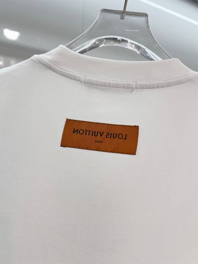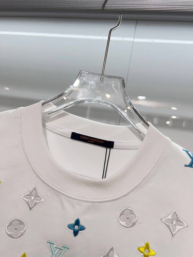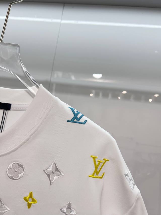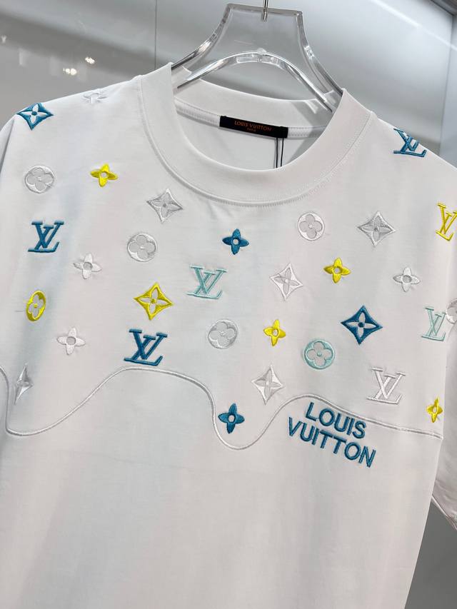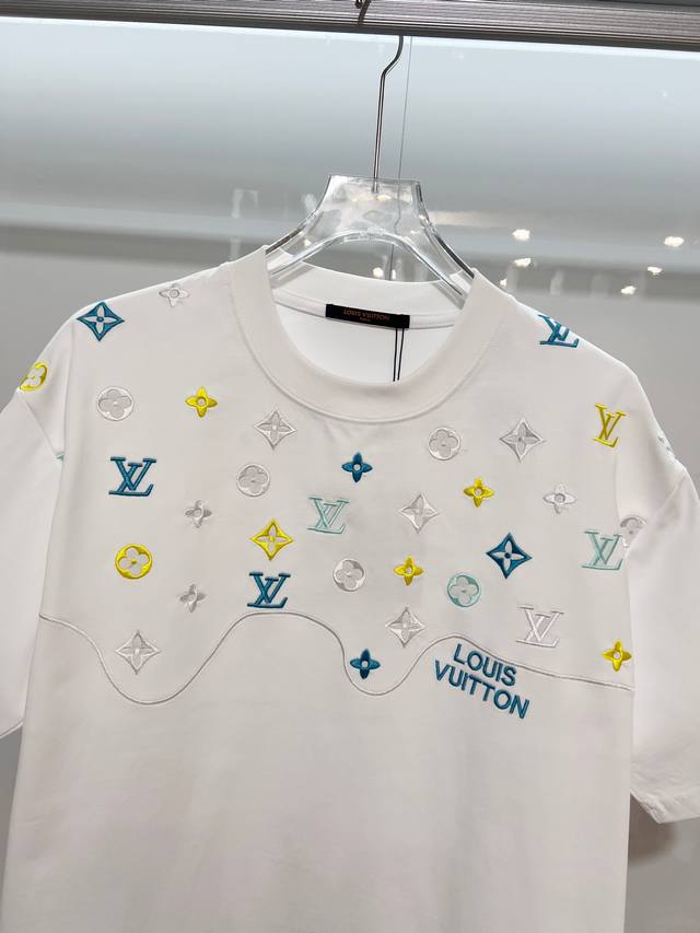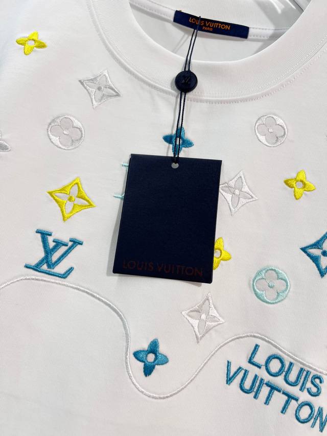 Louis Vuitton LV 2026 New Wave Pattern Embroidered Four-Leaf Clover Embroidered Logo Unisex Short-Sleeve T-Shirt. Custom 320g 100% Double Yarn Pure Cotton Fabric. Custom Dyed 32-Count Double-Strand Ribbed Fabric. Complete with Neck Label, Hang Tag, and Main Label. Color: White. Sizes: S, M, L, XL.