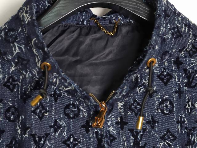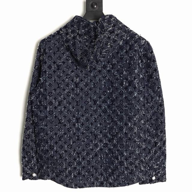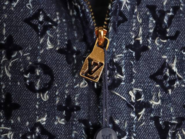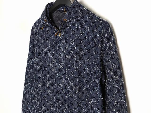 Louis Vuitton Lv 25Fw All-over Flocked Jacquard Denim Jacket. Exclusive custom-made thick slub denim fabric with brushed finish, classic Monogram pattern, flocked print, hand-tailored, distressed wash, original tassel effect, full hardware engraving, custom-made mold, perfect reproduction. Sizes: 46 48 50 52.