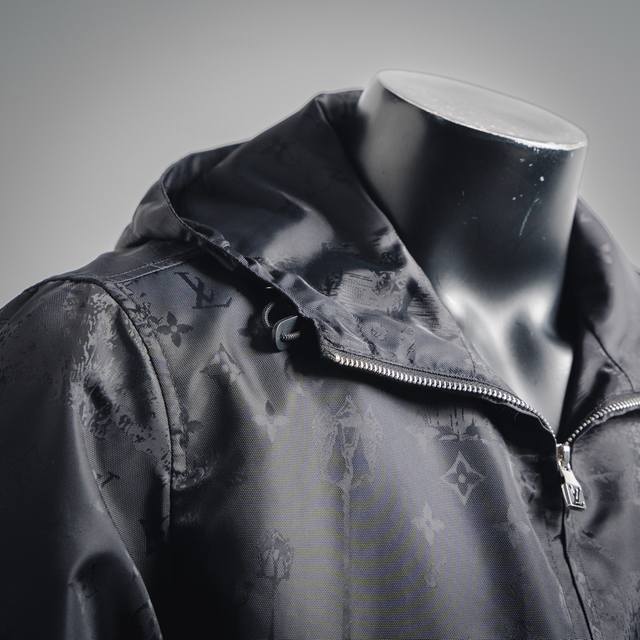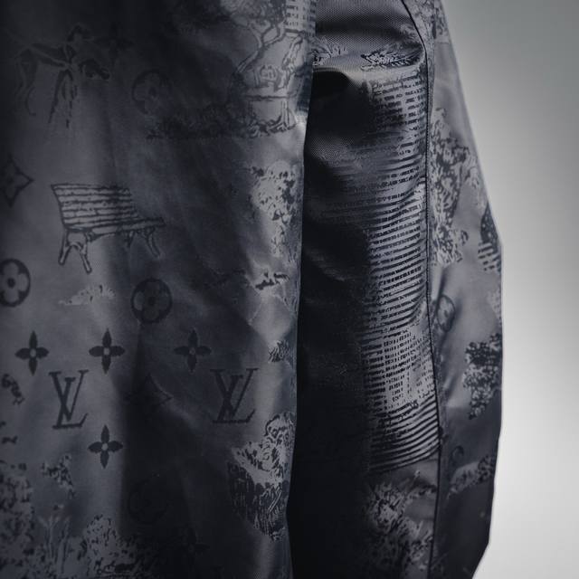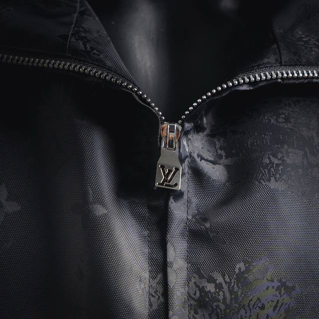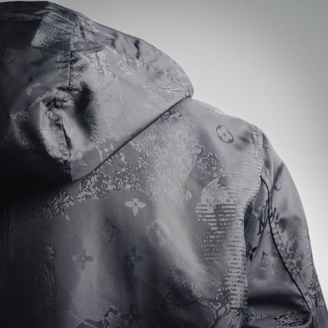 Louis Vuitton LV 25Ss Dog-Walking Jacquard Jacket (DDD) Made of 50D nylon Oxford jacquard fabric, using triangular bright filament yarn. Original scanned floral pattern, 85cm full-width repeating pattern. High-speed rapier loom weaving of the fabric. Front panel and pockets use 2+2 pattern reproduction hand-cutting, back panel uses positioning pattern cutting. The large pattern repeat results in increased fabric consumption. Features a size 5 white gold Swiss-style toothed zipper with a hollowed-out letter zipper pull. Lambskin leather edge-painted double-hole anti-slip buckle. Pig nose buckle, eyelets, and cylinder are made of white brass. Roll-plated brushed pattern in a light antique silver finish. Sizes: Xs, SML, DDD