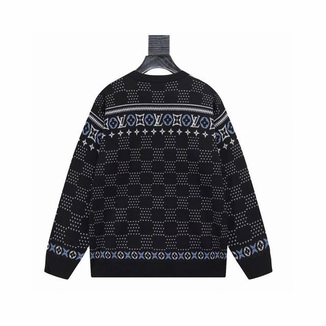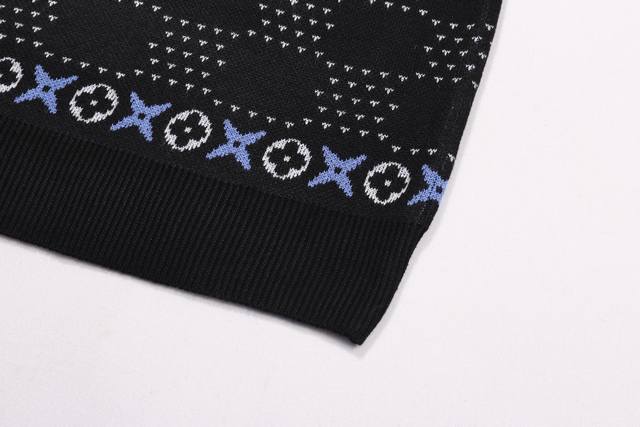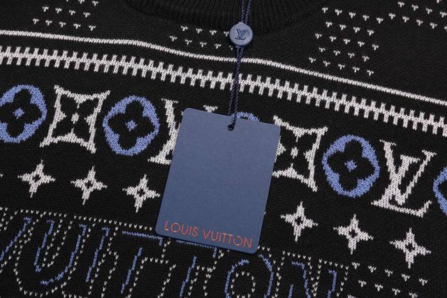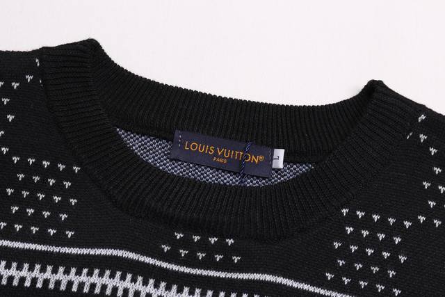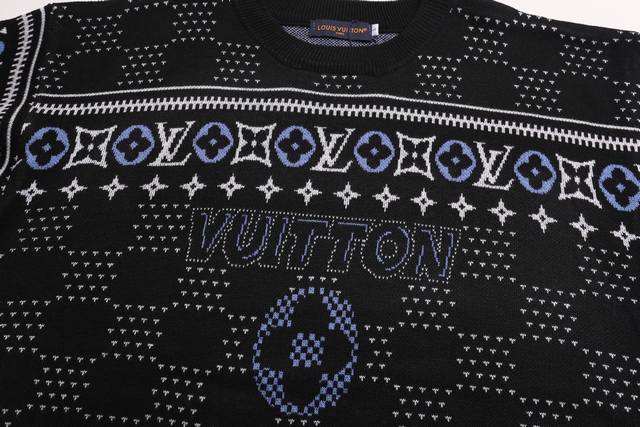 's quality meets luxury craftsmanship standards: 1. Jacquard Technique: Woven using imported Italian 12-needle precision jacquard equipment, the LV logo and Fair Isle pattern are precisely aligned with clear details, and the knit density in different texture areas is uniform, with no skipped stitches or irregular patterns; 2. Quality Control Details: Ribbed collars, cuffs, and hems use a custom weave, ensuring strong elasticity and shape stability; the fabric undergoes "pre-shrinking + low-temperature dyeing" treatment, resulting in high colorfastness and resistance to fading and deformation after washing; 3. Origin and Standards: Made in Italy, following LV's high-end quality control processes, from yarn selection to garment delivery, multiple rounds of quality inspections ensure texture and durability. Design Highlights: This sweater is a fusion of LV's classic elements and retro style. Key features include: 1. Logo and Texture Integration: The classic LV Monogram logo, featuring a four-leaf clover and lettering, is incorporated into a Fair Isle jacquard pattern, creating an all-over retro plaid and decorative trim. This retains brand recognition while adding a vintage feel. 2. Color Scheme: A black base is paired with white and light blue jacquard textures, creating a sophisticated and layered look that suits autumn and winter. 3. Fit: The loose, drop-shoulder oversized fit is suitable for unisex wear, offering a relaxed and casual style that blends retro and modern fashion. 4. Decorative Details: The "Vuitton" lettering is incorporated into the center of the front, echoing the overall texture and further reinforcing brand identity. This piece is a representative work of LV combining classic brand elements with retro fashion, showcasing the luxury brand's material and craftsmanship advantages while aligning with current retro aesthetic trends.