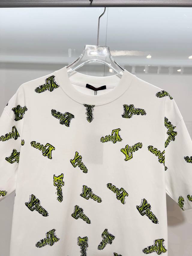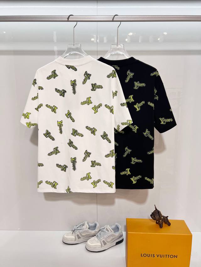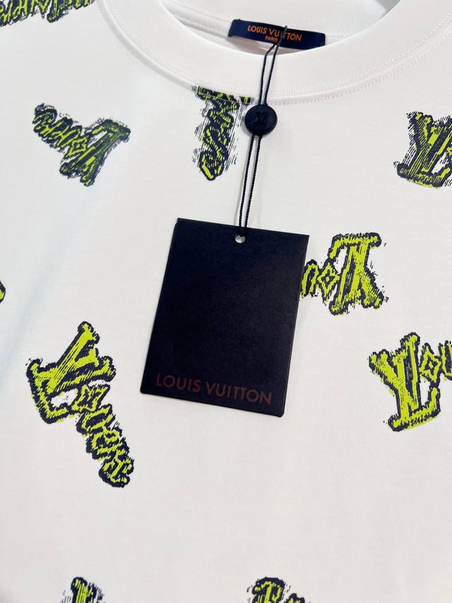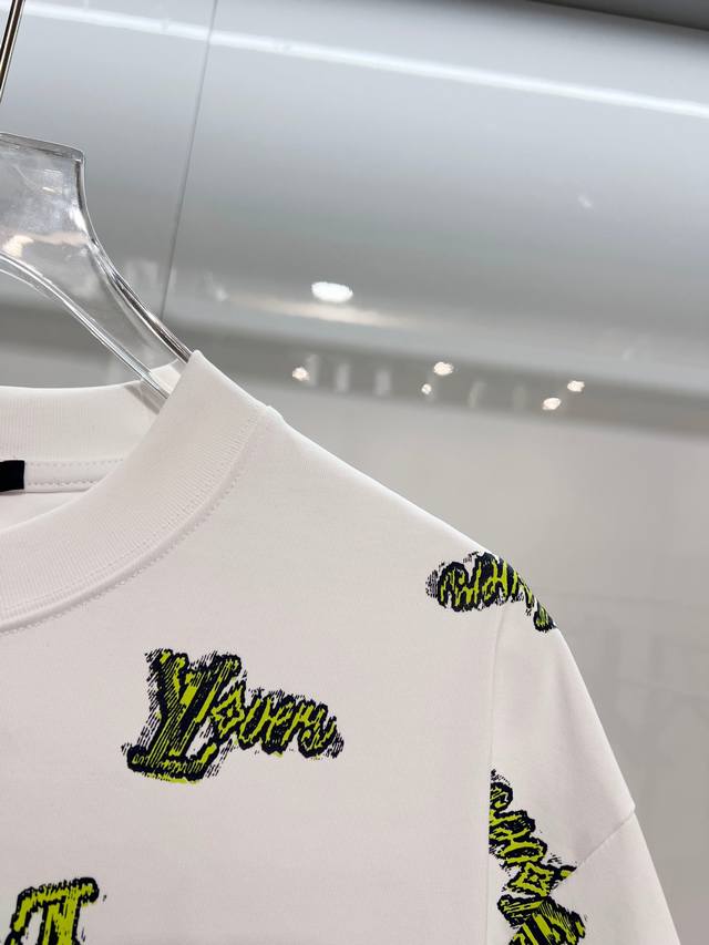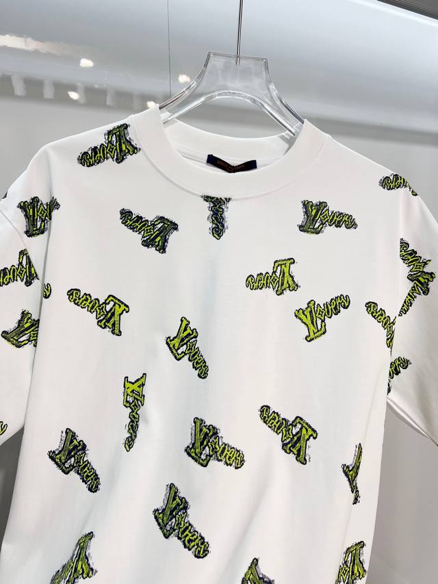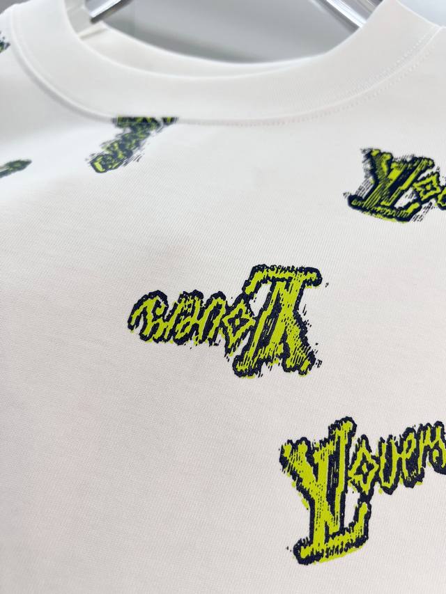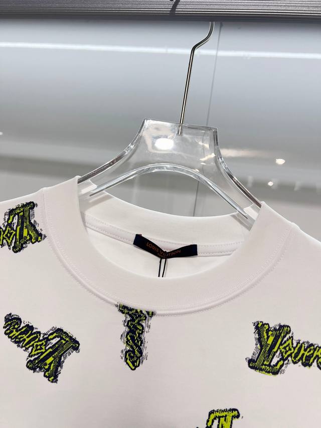 Louis Vuitton (LV) All-over graffiti logo unisex short-sleeved T-shirt. Custom 320g 100% double-yarn pure cotton fabric, custom-dyed 32-count double-ply ribbed. Complete with neck label, hangtag, and main label. Color: White. Sizes: S, M, L, XL.