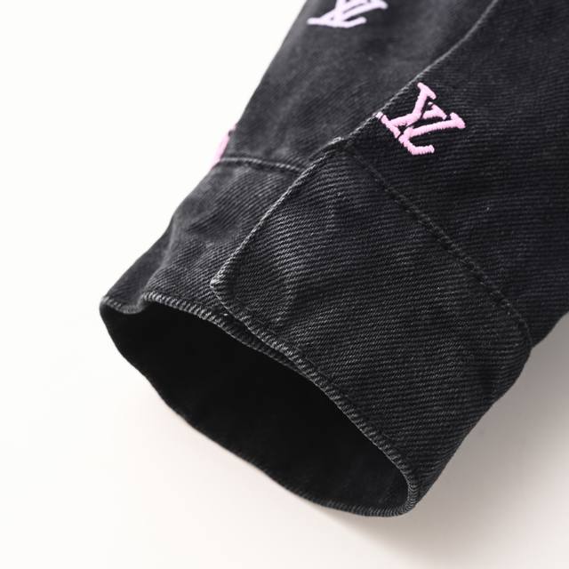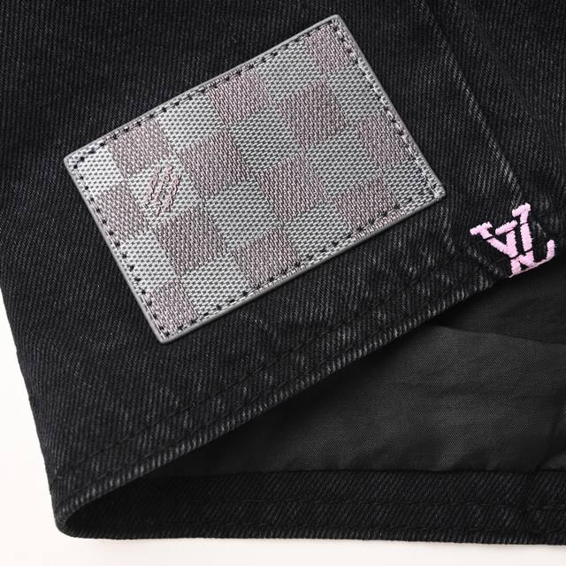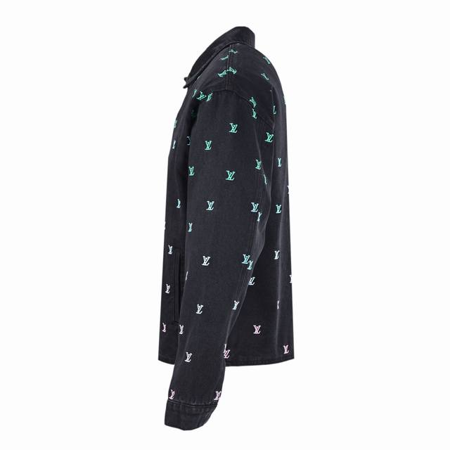 Made of washed black denim, it is embroidered with Lv Blason pattern all over, with a delicate gradient treatment, and the popular colors fade from light green to green, blue and purple. Pair it with skate pants to create a graphic overall look.