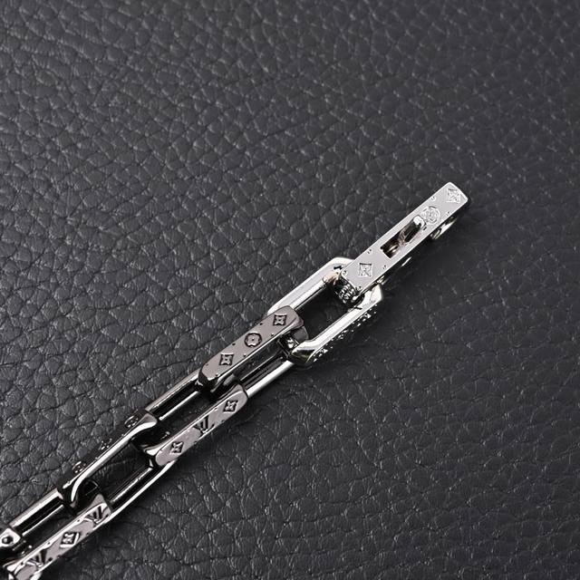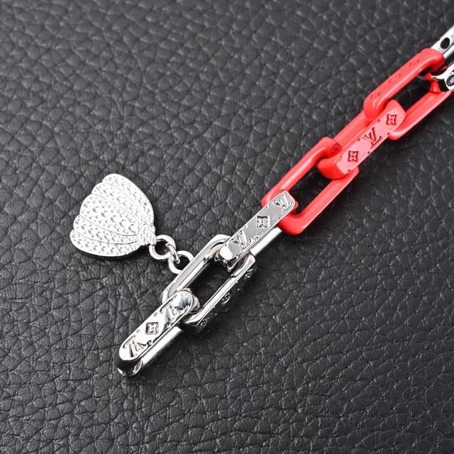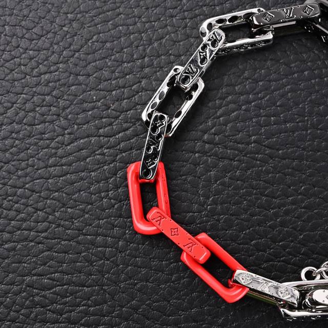 Louis Vuitton LV Limited Edition Chain Black and Red Bracelet. This bracelet is from the Louis Vuitton x Yayoi Kusama collaboration. Monogram-patterned metal constructs rugged chain links, scattered with enamel polka dots, interpreting the inspirational elements of the brand's second collaboration with this legendary artist. A pumpkin-shaped embellishment adds Kusama's signature brushstrokes. Size: 21cm. LV bracelet.