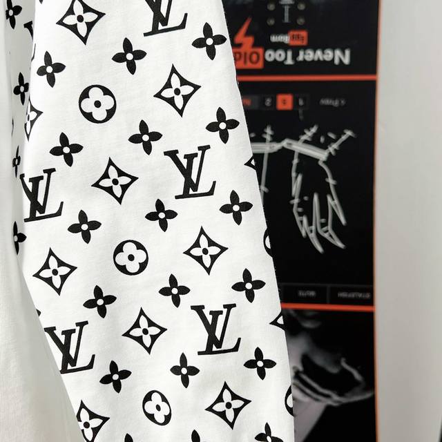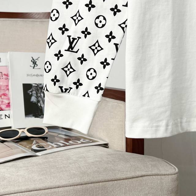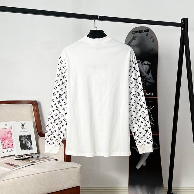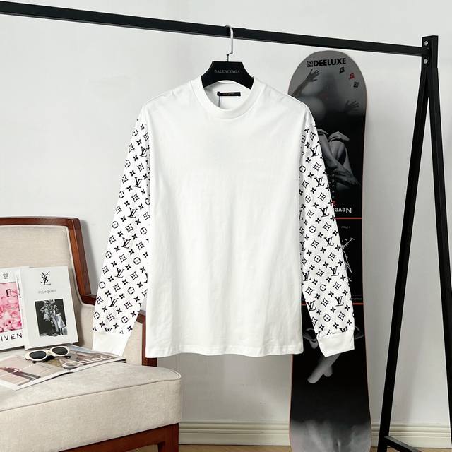 Louis Vuitton Lv Monogram Logo Print Long-Sleeve T-Shirt. Made with high-density elastic plastisol printing, the print effect is produced after computer color measurement and multi-directional printing testing. The print is lightweight and feels smooth, with high pattern fidelity, excellent color depth, excellent water resistance, washability, abrasion resistance, and colorfastness. Made with 32S pure cotton double-yarn plain weave fabric, 260g, skin-friendly and long-lasting shape retention. Matching 350g ribbed fabric, same dyeing batch with no color difference. Original custom label, hangtag, care label, logo, dustproof paper packaging. Authentic loose fit, unisex. Sizes: Xs-L. Color: White. Style Number: 9302.
