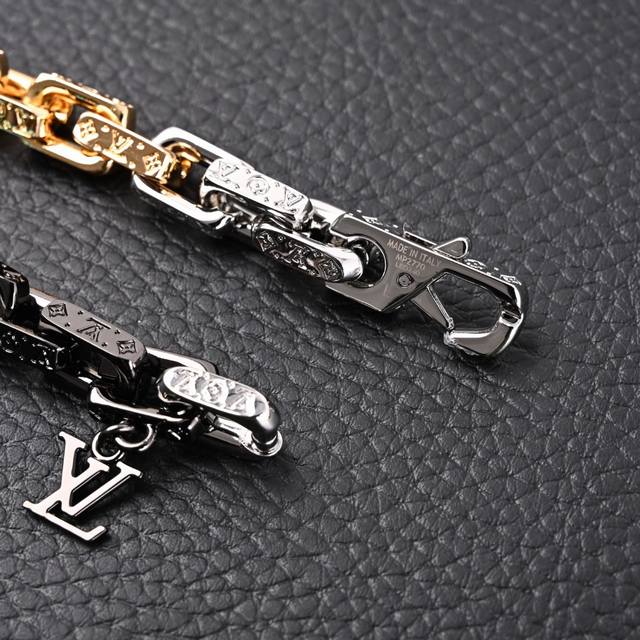 Louis Vuitton LV Paradise Chain Multicolor Pendant Bracelet for Men. Matte, polished, and glossy metals construct rugged chain links, with the LV lettering exuding classic style. Size: 22cm. LV bracelet.